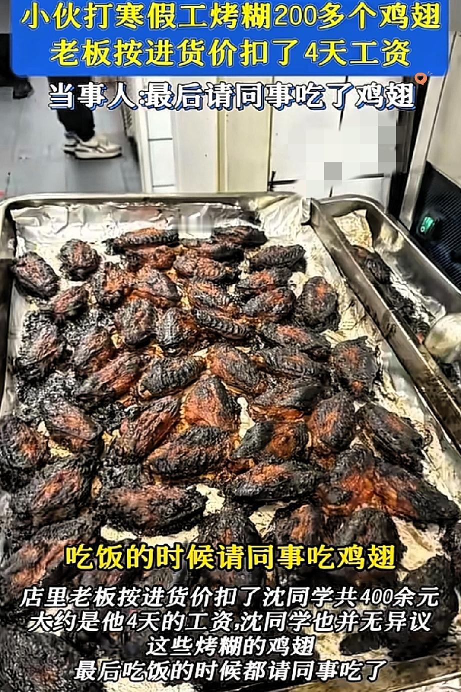 人能因粗心闯多大祸? 山东大二男生寒假烤翅兼职,一时忙乱忘计时,200多个鸡翅全烤糊,最后不仅十天工资一分没拿,还倒贴店里20多,这波操作属实让人心疼又无奈! 男生本想挣点学费零花钱,上手快还被店长表扬,可客流高峰一人盯两炉,忙中出错酿了祸,按规扣完损失、杂费和迟到款,直接从挣钱变贴钱,任谁都得觉得委屈。 但这事里,不只是男生的粗心,店家的处理方式也值得琢磨。 虽说提前告知了扣款规定,可学生兼职本就经验少,高峰时段人手不足的管理问题也该考量,全额扣款还倒贴,未免少了点人情味。 职场里失误难免,赔偿也该讲尺度,不能只让员工背锅,商家也该有对应的容错机制,毕竟比起扣款,让新人学会规避失误才更重要。 这次的经历是男生的一次深刻教训,却也戳中了兼职用工的痛点。 你觉得这家店的扣款规定合理吗?学生兼职失误该怎么赔才合适?