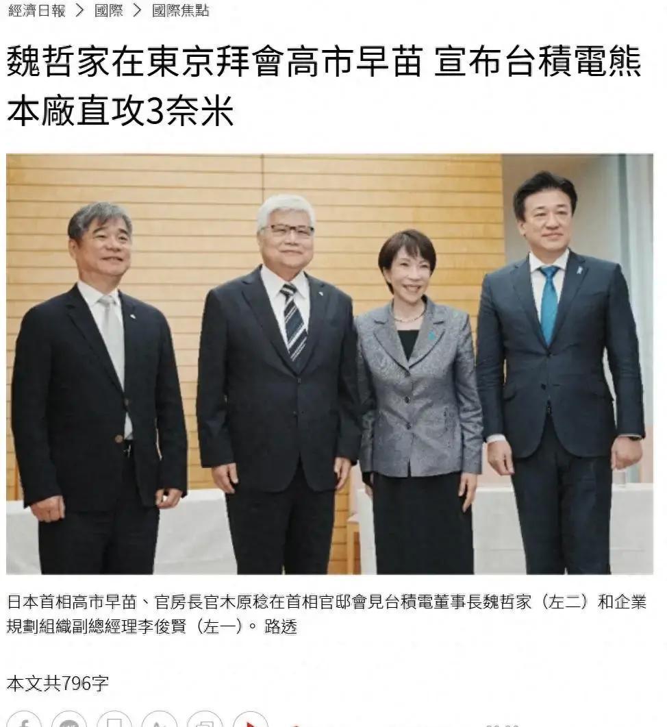 2月5日,东京首相官邸,台积电董事长魏哲家直接告诉日本首相高市早苗:熊本第二座工厂要直接上3纳米先进制程!原本只想做6到12纳米的中阶芯片,现在一步跳到最顶尖,投资也从122亿美元猛增到170亿美元,这事瞬间让全球半导体圈炸锅。 魏哲家这次拜访不是随便聊聊,而是带着明确计划去的。台积电看准AI需求爆炸式增长,决定把日本熊本打造成自家海外最先进的生产据点。第一座熊本厂2024年底已经量产,主要做汽车和工业用的成熟制程。现在第二座厂直接升级,等于帮日本补上先进芯片制造的短板。高市早苗当场表示超级振奋,还承诺政府会全力支持,包括补贴、政策和基建配套,确保项目顺利落地。 这个调整对台积电来说是商业聪明选择。全球AI热潮下,客户急需高性能低功耗芯片,把产能分散到日本能降低风险,也更靠近部分大客户。日本政府这些年砸重金振兴半导体,台积电这一步正好对上他们的战略需求。熊本厂未来量产3纳米后,日本本土就能自己做出用于数据中心、自动驾驶和AI机器人的顶级芯片,不用全靠进口。 岛内有些声音担心台湾半导体优势会削弱,但企业全球化布局本来就是趋势。台积电最尖端的2纳米以下还是牢牢守在台湾,美国亚利桑那厂也在推进先进制程。日本这个项目更多是补链强链,不会动摇台湾的核心地位。台积电全球多点开花,反而让供应链更稳健,客户更放心下单。 长远这对整个产业是好事。技术扩散带来竞争,也逼着大家加速创新。日本拿下3纳米产能,等于半导体版图更均衡,全球AI发展少一层卡脖子风险。台积电这一手,既赚到钱,又帮盟友补课,堪称双赢。