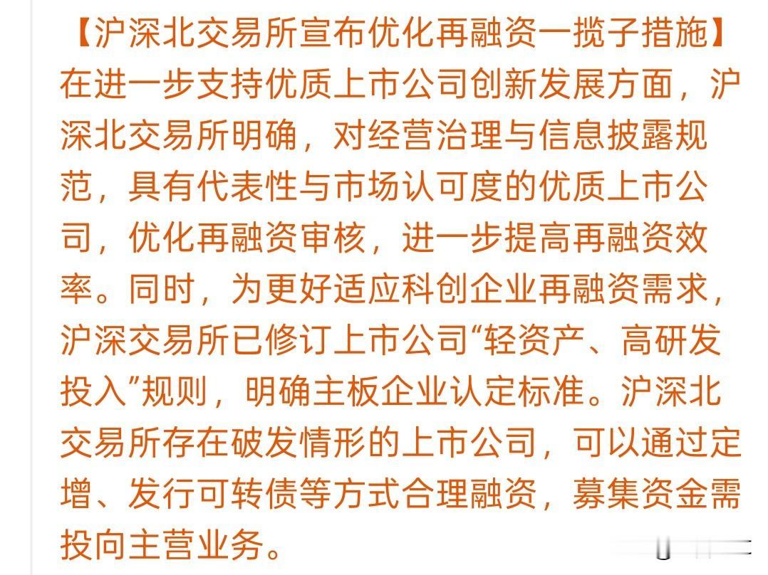 化债进入2.0,利好?利空?自己判断 难怪最近市场走得纠结,需要慢牛! 那是因为化债任务还没有完成,如果市场走得太快,大家捞一把就跑了。 从24年11月到现在,新股发行,并购重组,股东减持……化债已经让市场乌烟瘴气。 接下来再融资开闸,化债进入2.0版。他们还强调灵活性、便利度,简单说就是从宽从快。 再融资无非增发、配股、发债,别的不说,大家参考券商板块就知道了。 大家还是守好自己的存款吧,它们虽然收益低点,但是本金还能保证。