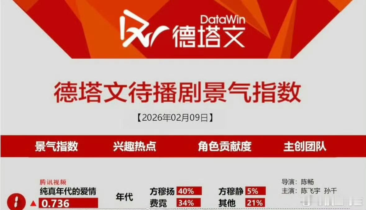 《纯真年代的爱情》即将播出,目前已经成为德塔文待播剧第一,陈飞宇角色贡献度40%,开始期待了吧