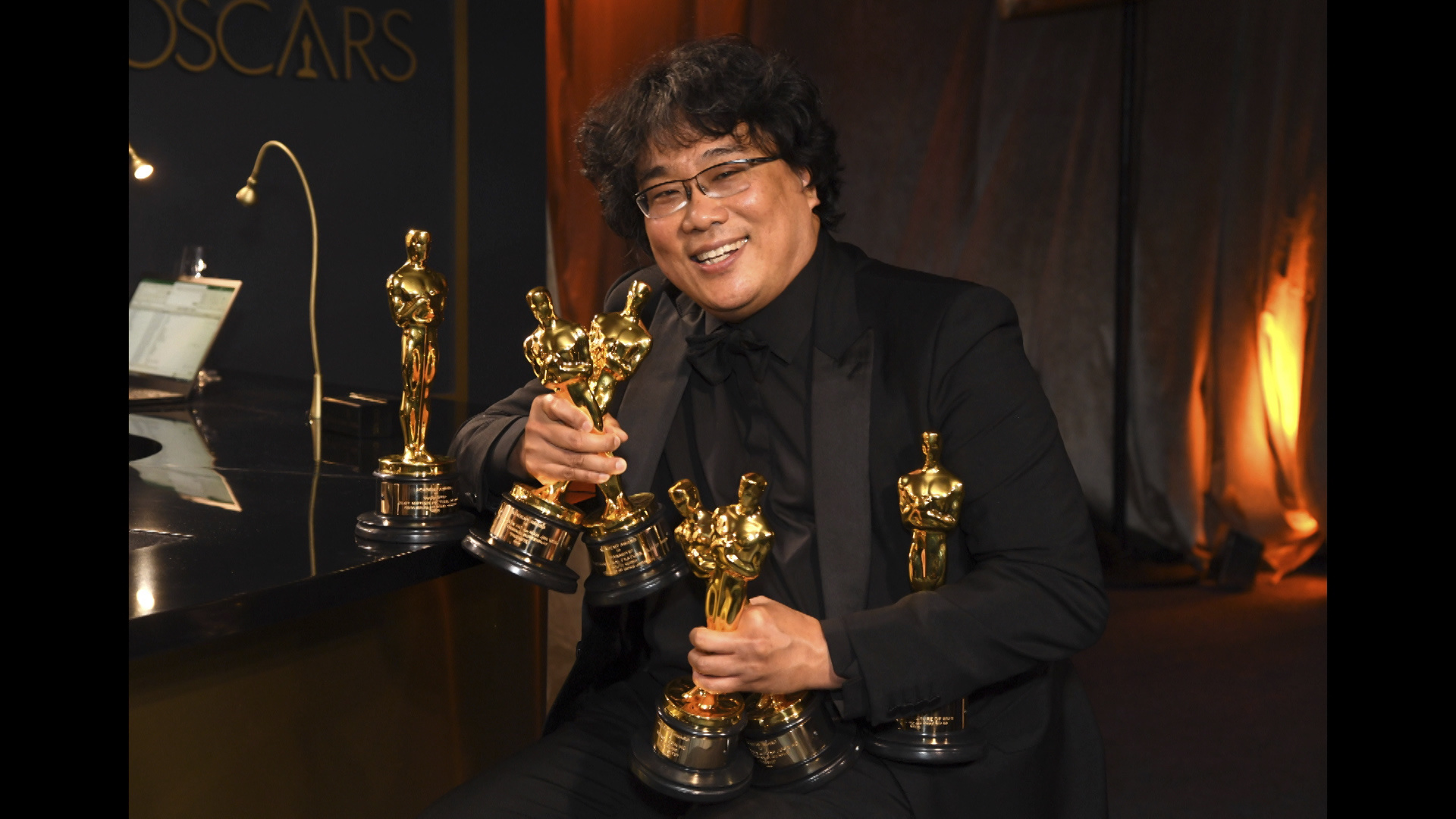 照片中有6座小金人是因为最佳影片和原创剧本奖均分别颁发给2人(郭信爱与韩进元)。