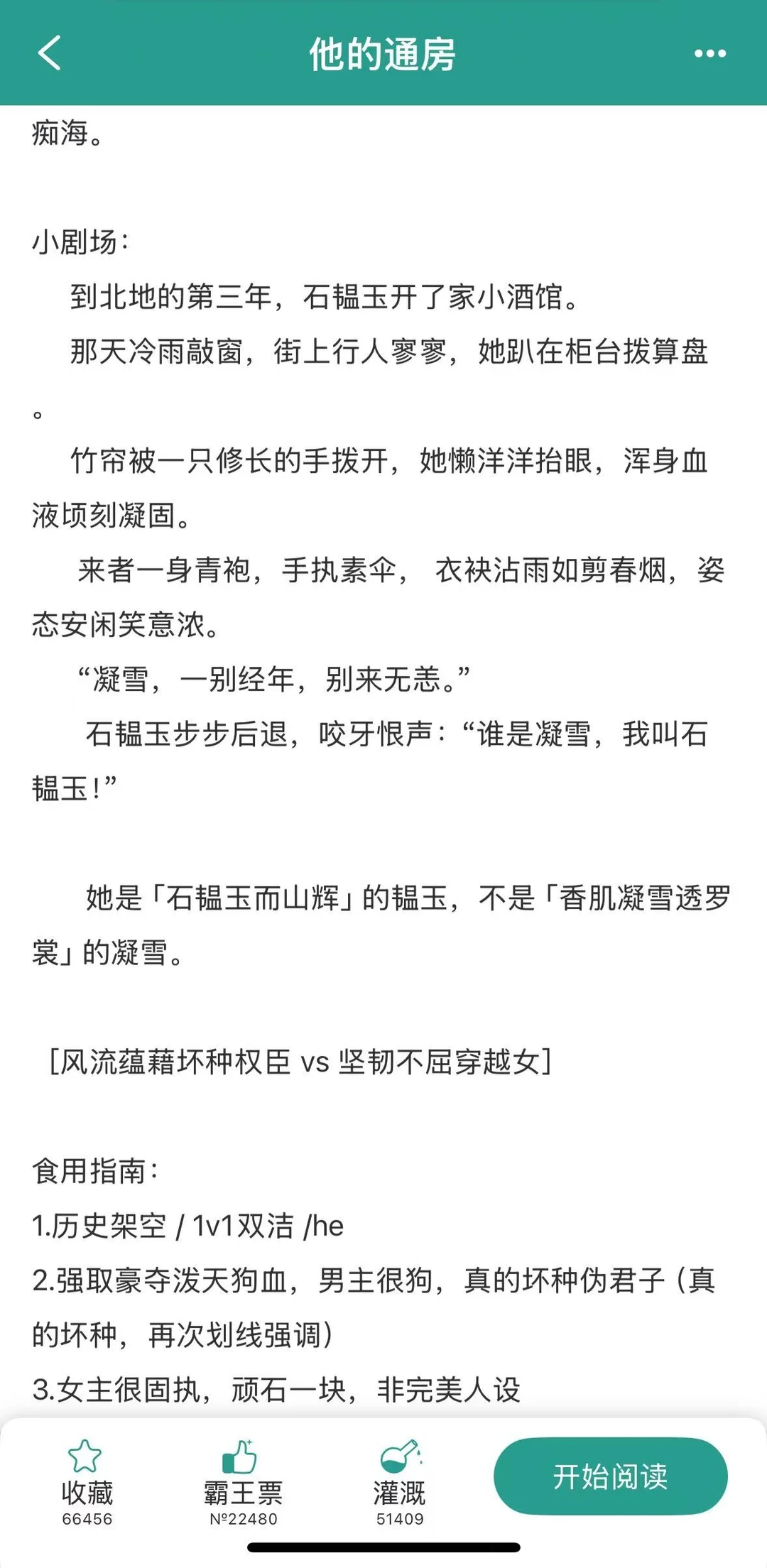 [种草R]从被卖后赐名翠翠,到男主赐名凝雪,再到女主自己的真名石韫玉,整个过程都可以看到女主的坚定和不屈。番外没有接着看下去,是男女主穿越回去之后的现代篇,作者大大在番外给男女主一个HE了。