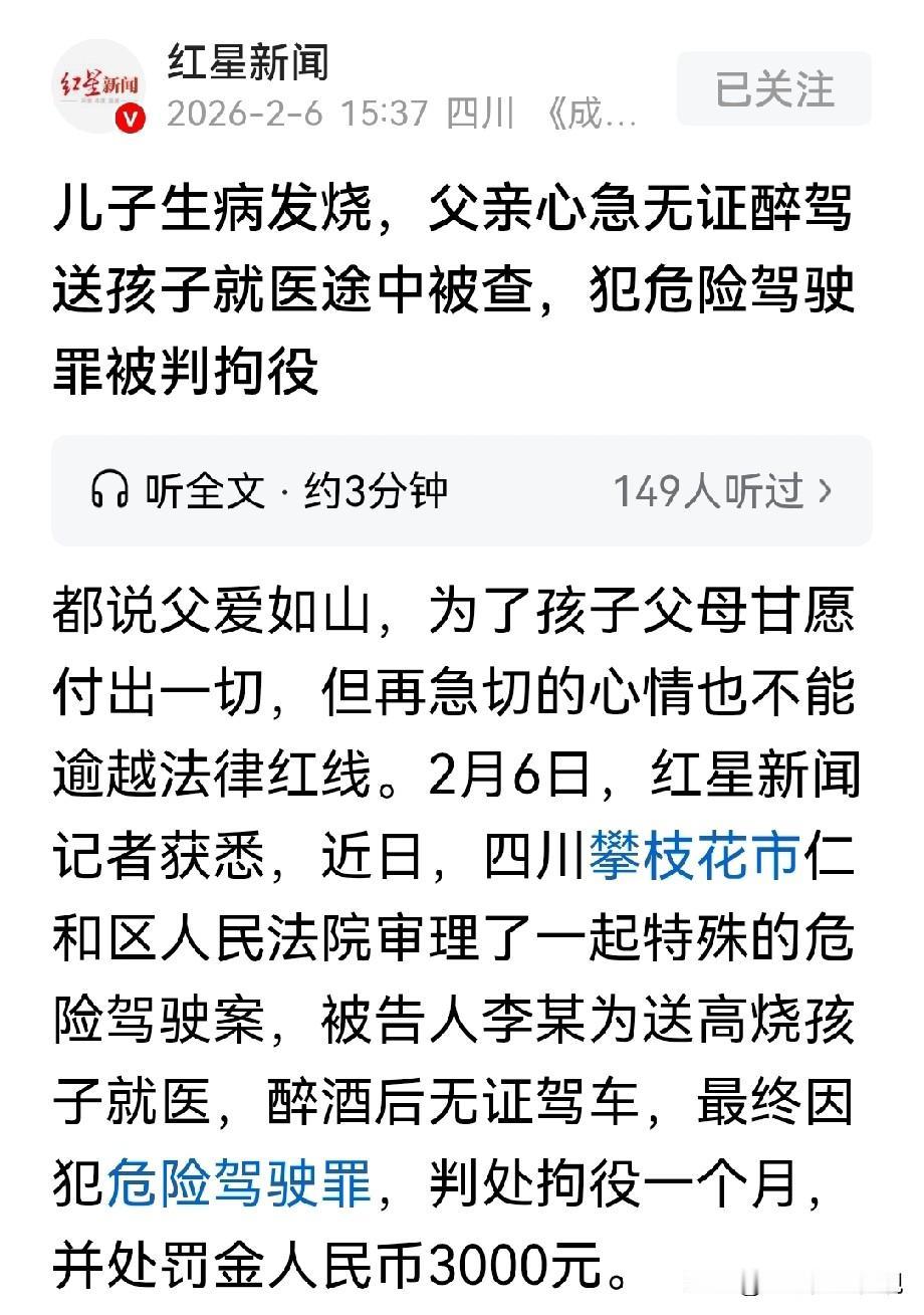 四川攀枝花,孩子突然发高烧,但住的地方离城里较远,孩子父亲想打车送孩子去医院,但找不到其他会开车的人帮忙。情急之下,孩子父亲在喝了酒的情况下,做出了一个无奈的决定,他驾驶弟弟停放的轿车,送孩子去医院,结果因无证、醉驾被判刑!一边是父亲为救孩子铤而走险的绝望,一边是法律对酒驾“零容忍”的铁律,到底谁对谁错,这事在网上吵翻了。 有些事情,明知道不该做,但那一刻,好像没有别的路可走。 李某蹲在墙角,抱着头,脑子里嗡嗡的,全是孩子烧得通红的小脸和急促的呼吸声。 2025年4月13日的下午,本该是安静的时候,可他3岁半的儿子浑身滚烫。 儿子因为支气管炎引发肺炎输完液回家,不知为啥,这会儿又烧起来了。 他家离城区的医院有段距离。 路特别不好走,平时叫个车也得等。 父亲长年有病,母亲腿脚不便,儿子是这个家里的掌中宝,说啥也不能有事。 中午他心里烦闷,喝了些酒,本想睡一觉,谁知孩子下午情况突然就不对了。 他试着打电话找人帮忙,可一时半会儿,能开车的人都没联系上。 看着怀里孩子蔫蔫的样子,他急得不知所措。 正好,弟弟的车正好停在家门口,钥匙也在。 李某没驾照,之前就因为酒驾进去过。 可这种情况下,他啥也顾不上了,救儿子要紧,一分钟都等不及了。 他抱起儿子,拉开车门,把儿子安顿在后座,自己坐进了驾驶室。 下午四点多,路上车不算多。 他开得有点急,只盼着快点到医院。 然后,他突然就看到了路边的交警,心一下子沉到了底。 交警示意他靠边停车。 摇下车窗的时候,就闻到李某身上浓重的酒气。 呼气检测,仪器上显示的数字是167。 之后抽血化验的结果更明白:172.9,远远超过了80的醉驾标准。 孩子在后座小声地哭,他站在路边,听着交警的问话,觉得浑身发冷。 执勤的交警了解了情况,帮忙联系了车辆将孩子先行送往医院。 他看着载着孩子的车走远,人像是被抽空了,只剩下无尽的后悔和后怕。 法庭上,公诉人宣读起诉书。 李某没什么可辩解的,事实就摆在那里:无证、醉驾,血液酒精含量172.9mg/100ml。 他当庭就认罪认罚。 他自己知道不对,知道危险,就是当时太急了,话是真心话,可法律不听这些。 法院审理后认为,李某的行为已经构成了危险驾驶罪。 他坦白、认罪认罚,这些都可以作为从宽处理的考虑。 但是,他之前就有过危险驾驶的前科,而且这次还是无证驾驶。 这些,都是要从重处罚的情节。 所以,缓刑是不可能了。 无证开车本来就危险,喝得这么醉还开车,车上还载着生病的孩子。 万一路上出了事,撞了别人或者伤了自己和孩子,那后果,谁能承担? 最终,法院判决,李某拘役一个月,罚金3000块钱。 有人说,理解一位父亲,在孩子急症时的绝望,但醉驾有可能害人害己。 遇到急事,也得用合里合法的救急,拨个120救护车,医生有设备,比他自己慌里慌张开车安全多了。 有个父亲称,自己儿子小的时候发过一场烧,烧到抽搐晕厥,开车送医院途中又遇堵车。 自己记得直接下车抱着儿子跑到医院,这种时候,没有哪个父亲会考量各种结果。 所以说,这种情况可以称为紧急避险。 但法律摆在那里,不是为了刁难谁,是为了保护所有的人。 包括当时李某车上的孩子,也包括路上其他完全不知情的人。 那么,从法律的角度来分析,如何看待此事? 根据《刑法》第133条之一:在道路上驾驶机动车,有下列情形之一的,处拘役,并处罚金: (二)醉酒驾驶机动车的。 结合本案具体情节,李某醉驾,且无证驾驶,其行为已构成危险驾驶罪。 醉驾被立法明确为犯罪,因其对公共安全构成直接威胁。 即使未造成实际事故,酒驾本身即被认定为具有危险。 李某无证驾驶机动车本身违法,且增加事故风险。 李某曾因危险驾驶罪被判刑,此次属再犯,法律需强化惩戒以防止重复违法。 虽然李某的动机是救子,但紧急避险,需同时满足以下条件。 孩子病情是否已达“危及生命”程度。 是否穷尽其他合法方式,如拨打120、或附近驾驶人。 保护的法益需显著大于损害的法益。 李某未尝试其他救助途径,且其行为已构成严重醉驾,不符合紧急避险的严格要件。 司法判决的社会意义,法院在量刑时兼顾了天理人情与法律底线。 李某认罪认罚可从宽,但前科和无证驾驶需从重,最终判处拘役一个月,体现罚当其罪。 紧急情况并非违法借口,应鼓励优先选择120急救、警车护送等合法方式,既保障生命安全,又避免扩大风险。 法律对醉驾的严格态度,本质是保护所有人的生命权。 李某的父爱令人动容,但其选择的方式,已触碰法律红线。 此案提醒我们,在紧急情况下,应优先通过合法途径求助,这既是对他人负责,也是对家人最深的保护。 对此你怎么看? 关注@赵哥的法律观,评论区发表你的看法。