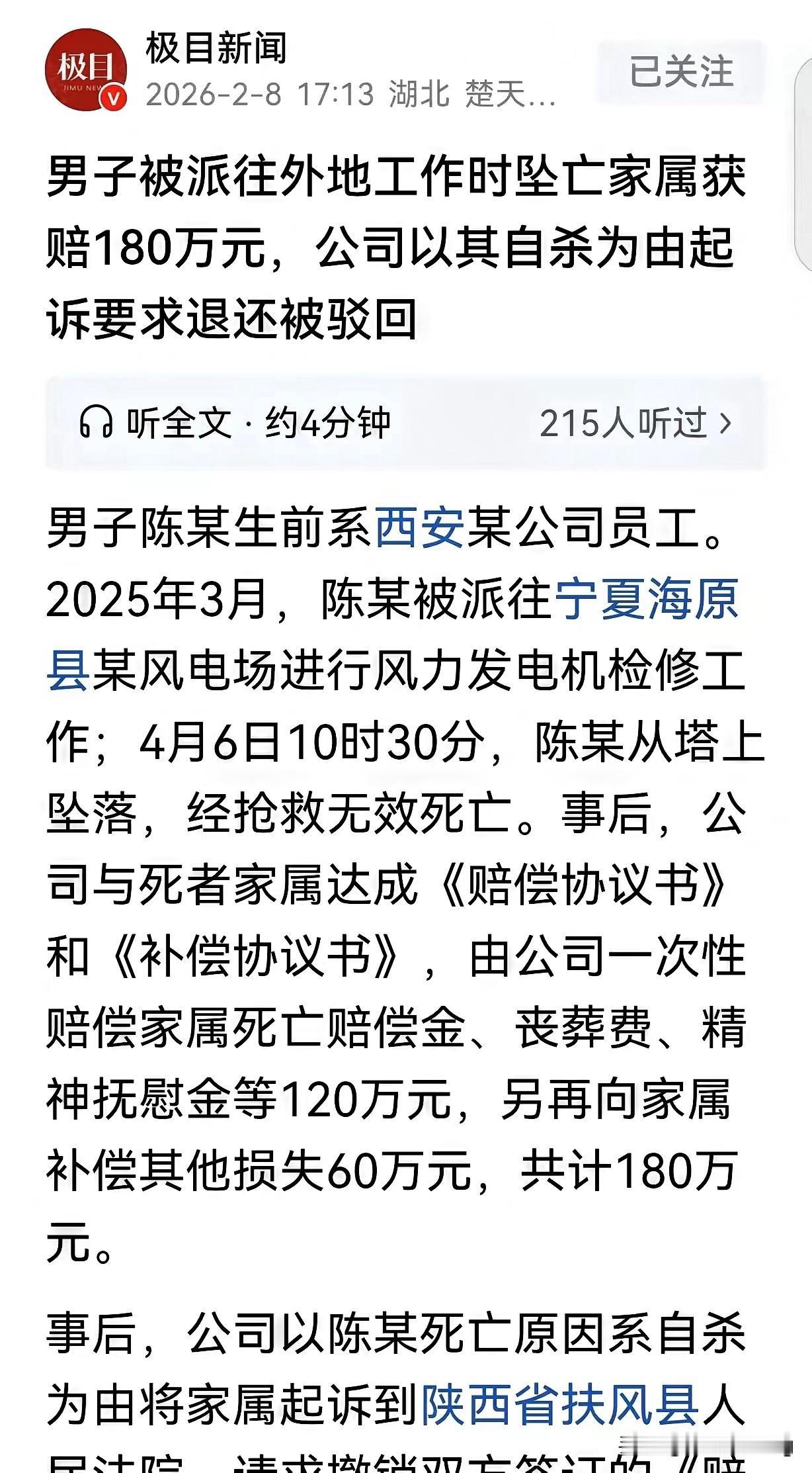 吃相太难看!陕西男子工地上坠落身亡,公司赔180万后发现他欠网贷,竟起诉要回赔偿,二审判决大快人心! 自愿签的赔偿协议,钱到账又反悔,这哪是讲诚信的企业该有的样子?公司查员工手机恢复数据的操作,本身就透着不地道,就算有网贷记录和吐槽,也不能证明是自杀。 法律讲的是证据,没监控没目击者,凭啥认定是主动跳塔?当初嫌调查麻烦急着了结,现在又想秋后算账,把风险转嫁给孤儿寡母,实在让人不齿。 法院维持原判太对了,既守住了契约精神,也护住了最弱势的家属。企业的体面从来不是一时的大方,而是遇事不推诿、签单不反悔的担当。 你觉得公司这波操作合理吗?换你是家属会退钱吗?评论区聊聊~
