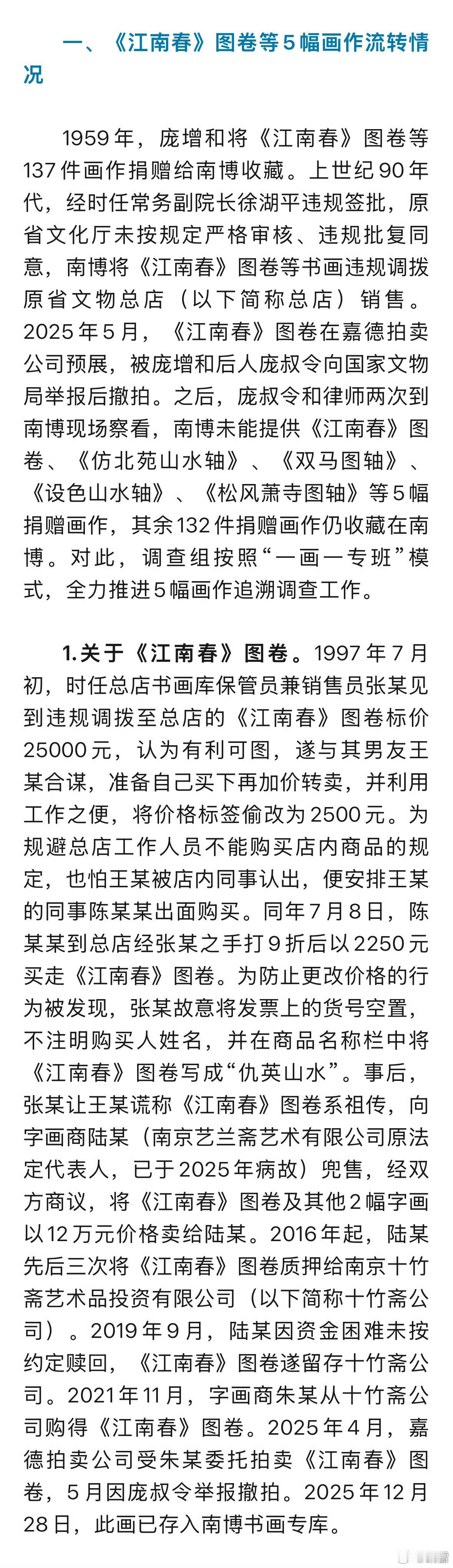 南京博物院致歉张某,女,史上最牛保管员。 可怜见的仇英《江南春》被合理合法有发票卖了两次,一女两卖,1997年7月8日年,2250卖一次;2001年4月16日,6800块卖第二次。表面有发票,都有背书,但买者就是不敢用真名,也不敢显真身,就知道,这笔买卖买家都知道有多荒诞!