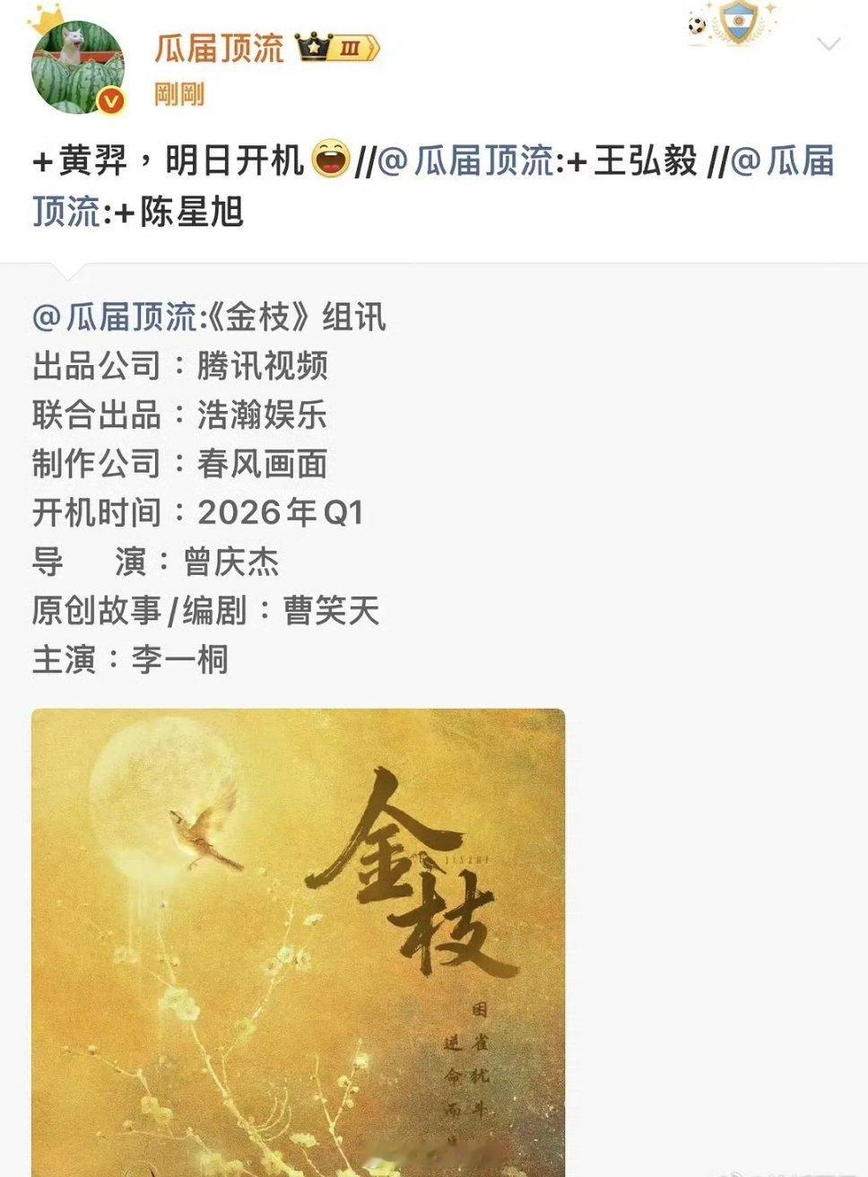 《金枝》人物关系图来了 🍉板上钉钉了,主演李一桐、陈星旭、王弘毅主演的金枝2月初开机,李一桐古装一向以古灵精怪著称,陈星旭古装天潢贵胄世家子弟气十足,选角很到位,可以期待起来了这次真的不一样 归鸾+金枝两个金饼女二,戏份都很多…黄羿作为一个刚出来的新人,几百场大戏还有自己手上正在补拍的盛世天下。未免有点太一口气吃成胖子了,现在被怀疑轧戏,真的很担心同时拍几百场戏的质量,话说这个黄羿怎么资源真的好?