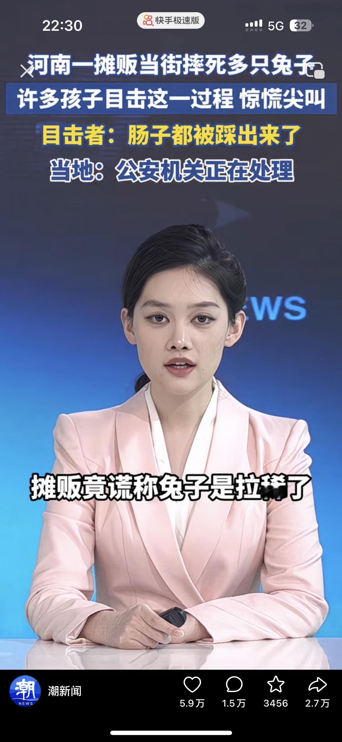 真是丧心病狂!警察来了就装傻,走了就发疯 河南街头一位商贩,因为生意不球迷,在人来人往的夜市把活生生的兔子举过头顶狠狠的摔在地上,还用脚疯狂的碾压,兔子的肠子都被踩的一地!现场的孩子和大人都被这恐怖的一幕吓的不寒而栗。 警察赶到现场,他居然面不改色的说地上的兔子是拉稀死的,警察走了他又开始摔死好几只兔子 这种人真的不配为人,生意差就拿着无辜的小动物发泄,简直是泯灭人性