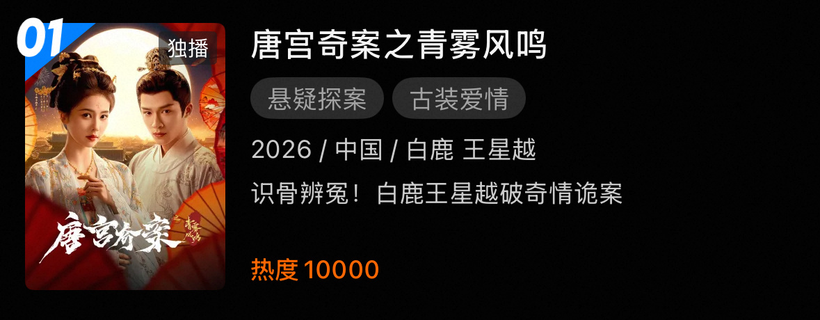 恭喜我们唐宫奇案工作日再度破万🔥🔥🔥观众被留住 也在不断的稳定入场 这个唐宫奇案从第一集开始就好看 越来越高能的剧情值得!!请不要错过这个唐宫奇案好吗 不要错过这个白鹿李佩仪!!