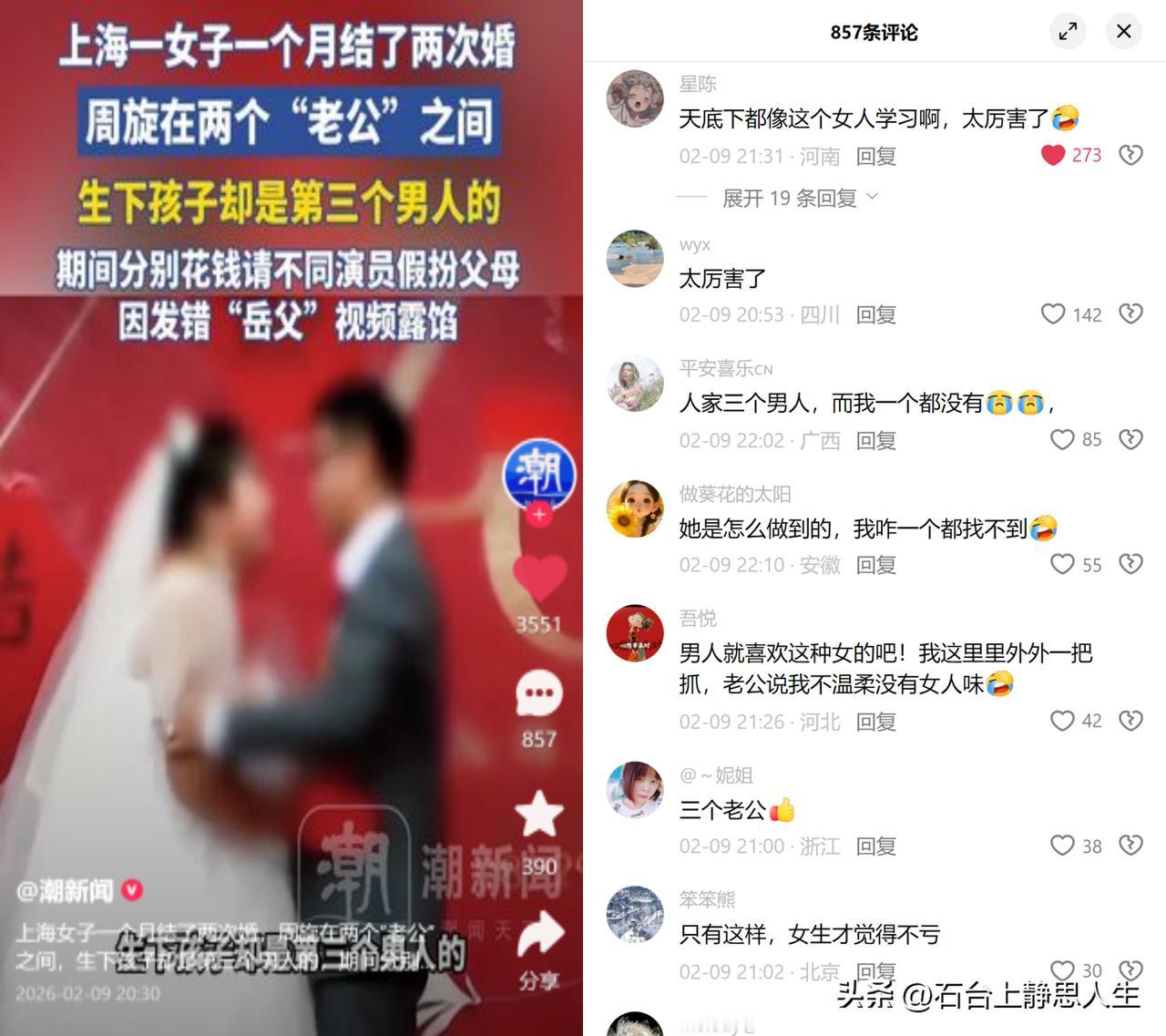 一月两婚露馅,别骂婚姻法。 最近这事闹得热闹,上海一女子周旋两位“丈夫”,孩子却是第三人的,还花钱雇演员扮父母,最后发错视频露了馅。评论区有人酸她“手段绝”,有人自嘲单身,还有人喊“婚姻法形同虚设”。 真不是法规没用。现在全国婚姻登记早就实时联网,跨省领证都能秒查,想领两本结婚证基本没可能。大概率是只办了婚礼没领证,属于民事欺诈,不是重婚。大伙觉得“婚姻法形同虚设”,多半是把十几年前的系统漏洞和现在混了,本质是怕自己的真心被辜负,怕有人钻信任的空子。 成年人的世界里,最该警惕的从来不是规则的缝隙,而是那些披着感情外衣的算计。你遇见过类似的套路吗?