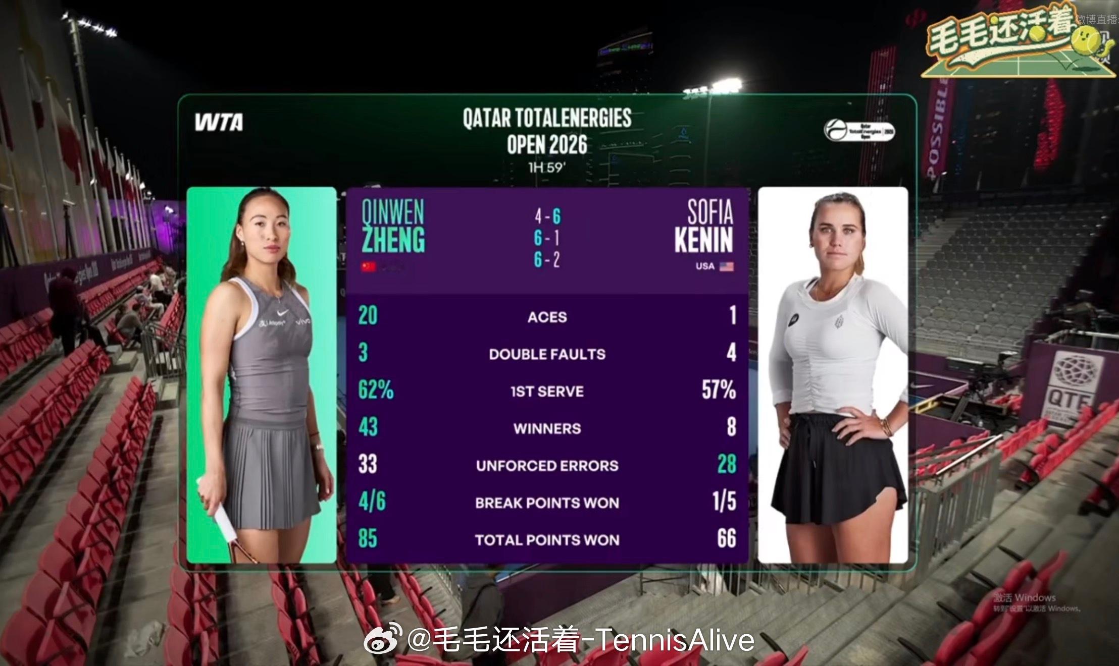 今天郑钦文完全 Ace 女王,发出了 20 记的 ACE 球。一发成功率很高 62%,一发得分率也是很高 85%。在开场有点跟不上肯宁的节奏,在第二三盘瞬间调整。完全进入到顶尖状态当中。有这样的发球护体,郑钦文完成一个轻松的逆转。