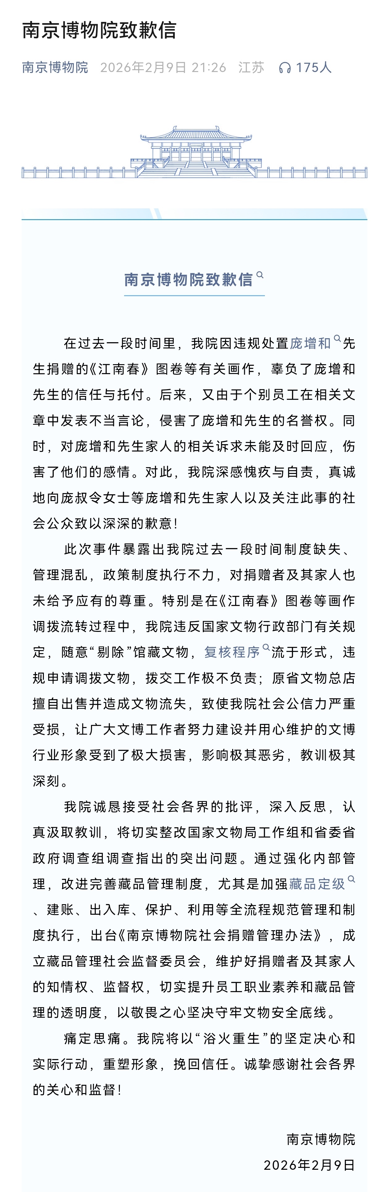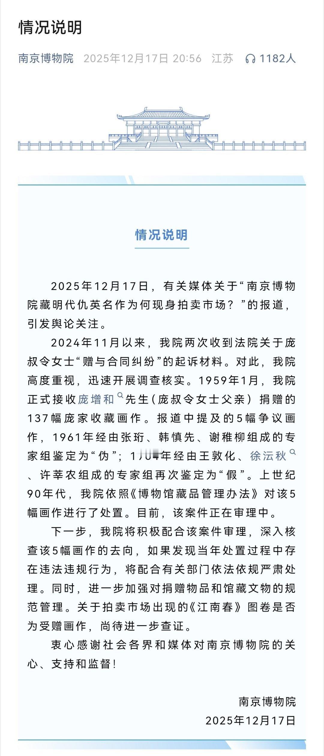 南京博物院道歉——2025年12月17号的情况说明中还在表示“按照博物馆藏品管理办法》对该5幅画作进行了处置”。热点观点南京博物院事件最新通报