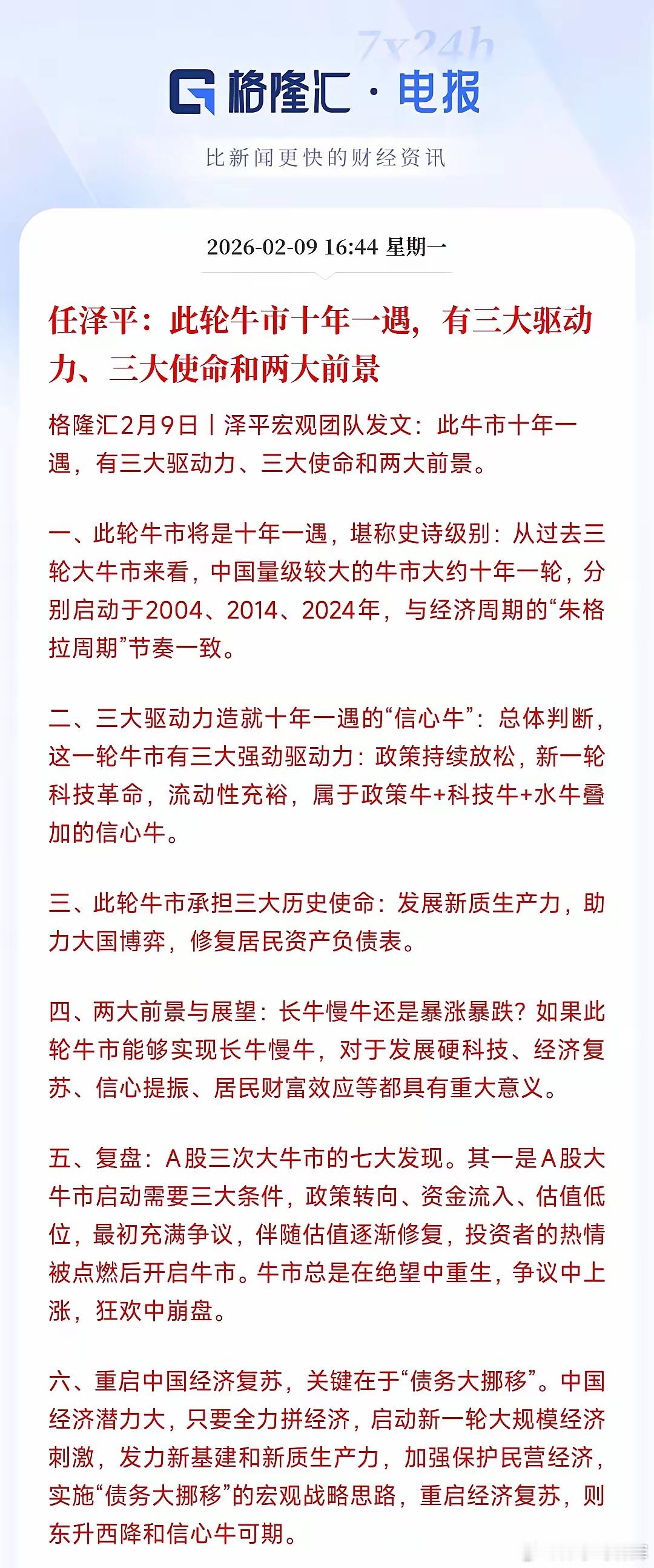 任泽平又发话了,认为这轮牛市十年一遇任泽平表示:本轮的牛市有三大原因1.政策持续放松2.科技股革命3.持续的流动性