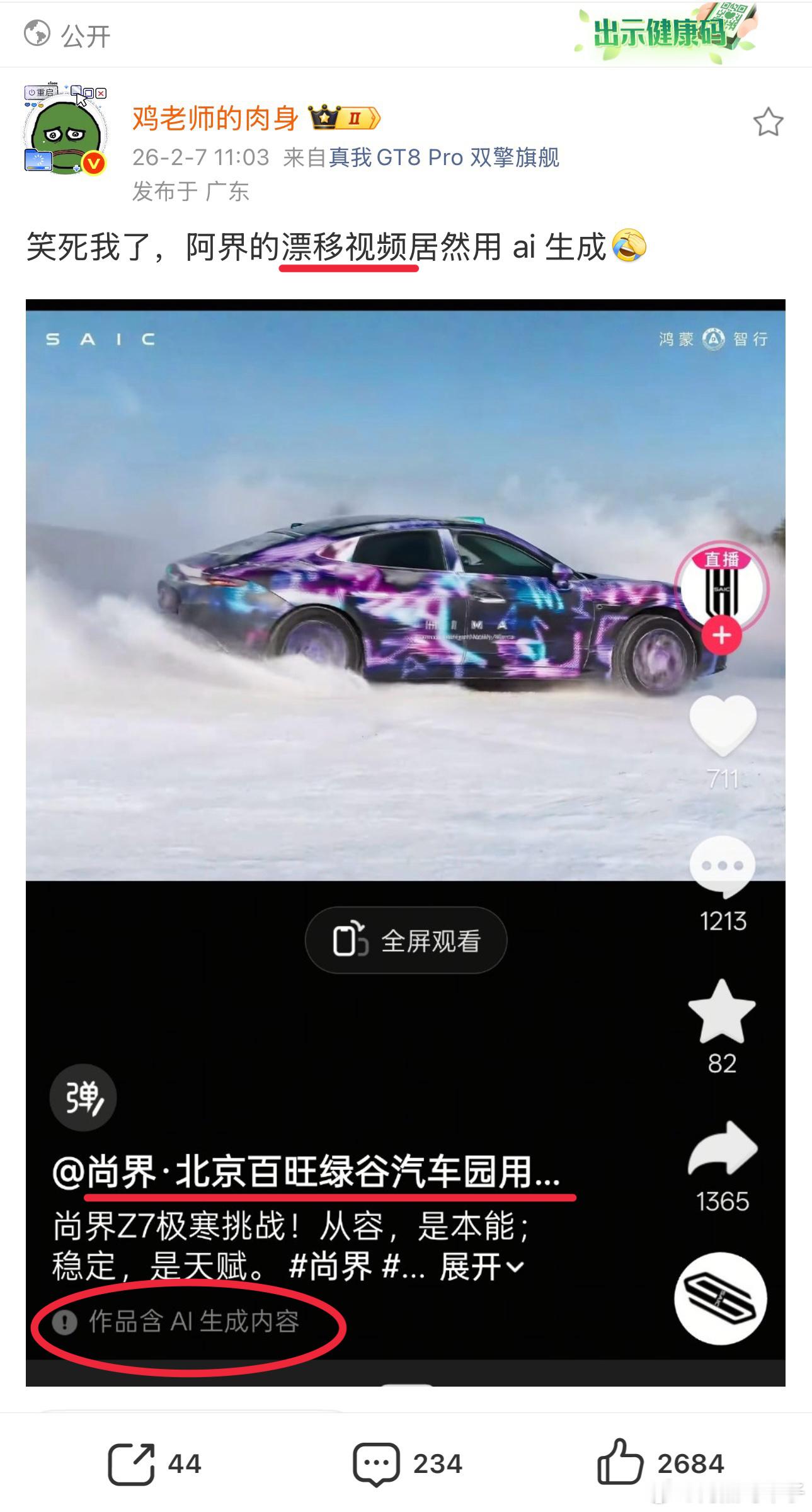 说冤,是因为这个含AI生成的视频不是尚界汽车官方发布的,而是尚界北京百旺绿谷汽车园用户中心发布。