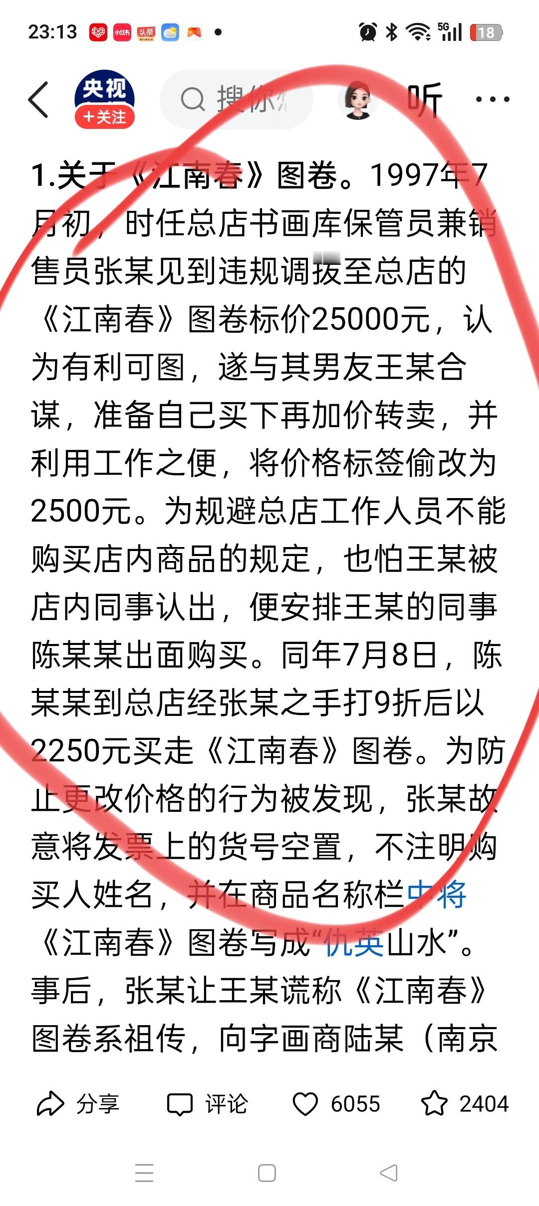 徐湖平的问题,我一点都不惊讶! 央视新闻设置了评论管理,我也不惊讶! 但看了《江南春》这幅画被卖的整个流程,真的把我惊讶到了! 1997年,当时的一个画库保管兼销售员发现《江南春》画卷被标价25000元时,居然可以把它改成2500元。还委托朋友给它买走,最后还打了9折,连发票上的货号也可以不填,购买人的姓名也不填,就这么轻而易举的被买走。 说明当时这个单位的管理非常的松散,并没有一套成熟的方案。要不然也不至于事后这么多年都没有人查出来,直到被庞家后人发现。 现在5幅画已经找到了4幅,并重新存入南博书画专库。 只希望这样的事,以后再也不会发生,不能让那些捐赠者寒心。如果有捐赠者想取回,是不是也可以考虑归还呢[what][what]