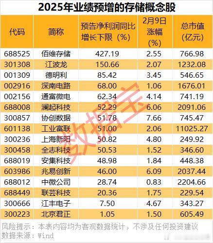 价值投资日志 据数据宝统计,A股中布局存储产业链的个股共有47只,今日全线上涨,概念股中深康佳A涨停,复旦微电和华正新材均涨超9%,江丰电子股价创下历史新高。从业绩上来看,目前37股已发布2025年度业绩预告或业绩快报,其中16股归母净利润预计实现同比增长,6股扭亏为盈,4股减亏,报喜比例超七成,企业盈利能力明显增强。按预告归母净利润同比增长下限计算,佰维存储、江波龙预计归母净利润增幅均超过100%。