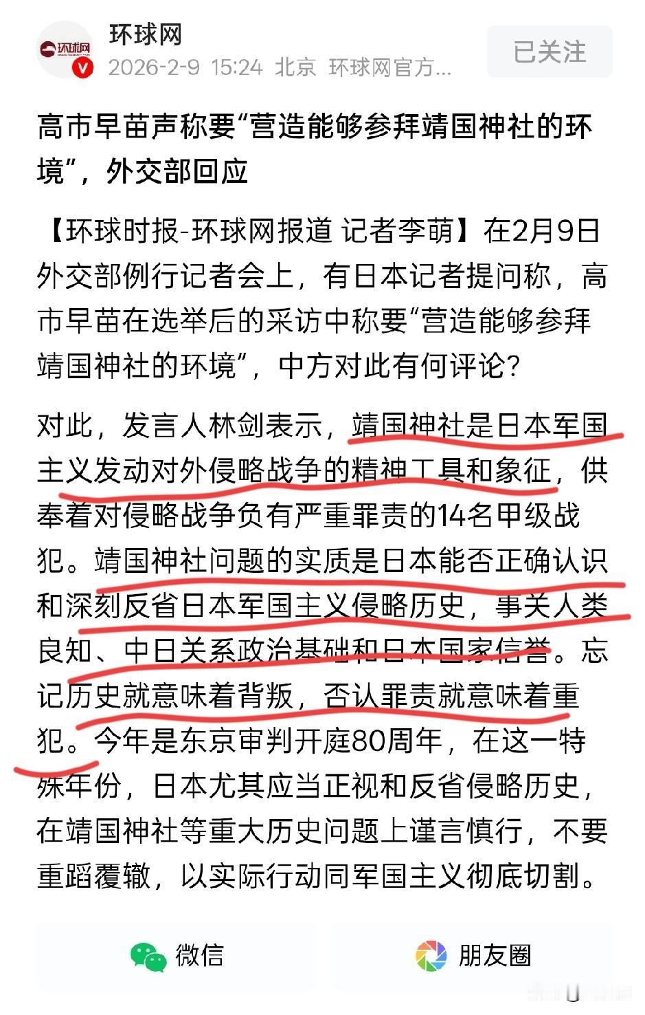 我国外交部对于日本首相高市早苗表示要营造参拜靖国神社的环境氛围做出了回应,由于靖国神社摆放了日本全面侵华的甲级战犯。参拜靖国神社就意味着日本不能正确认识和反省日本曾经犯下的罪行,就是背叛历史,否认罪责就意味着重犯。对于高市早苗的谬论予以了强烈的反击。面对我们的强烈批判,高市早苗仍然会一意孤行,所以我们必须时刻保持警惕,警惕日本军国主义。警退日本再次给世界和亚洲带来巨大的危害。