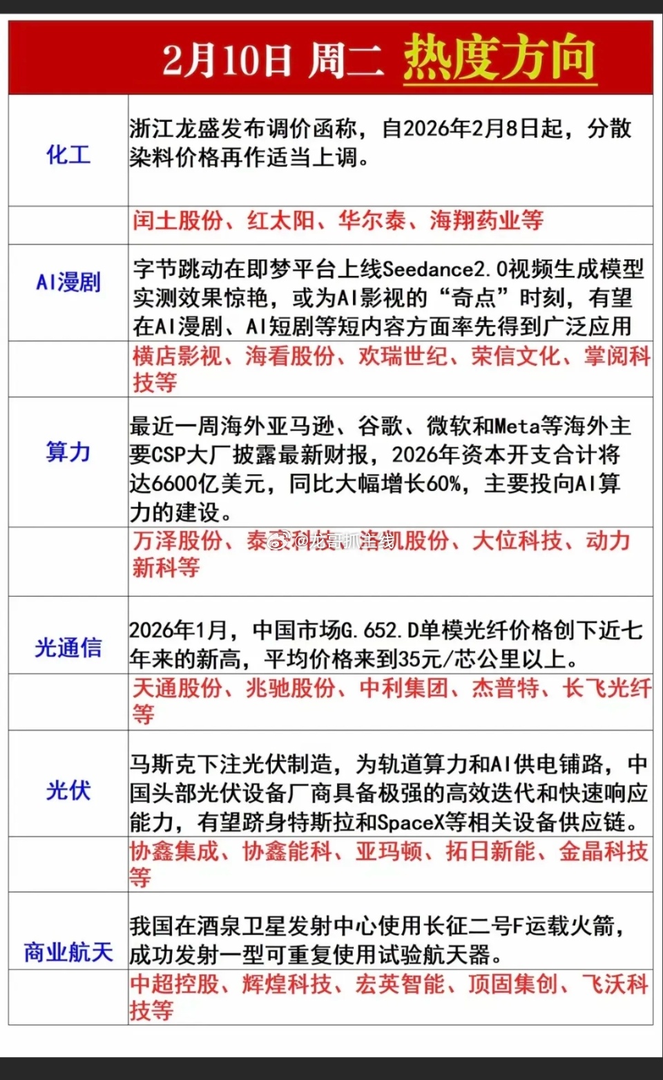 1.化工染料,涨价题材2.人工智能,AI漫剧3.算力4.光通信5.太空光伏6.商业航天