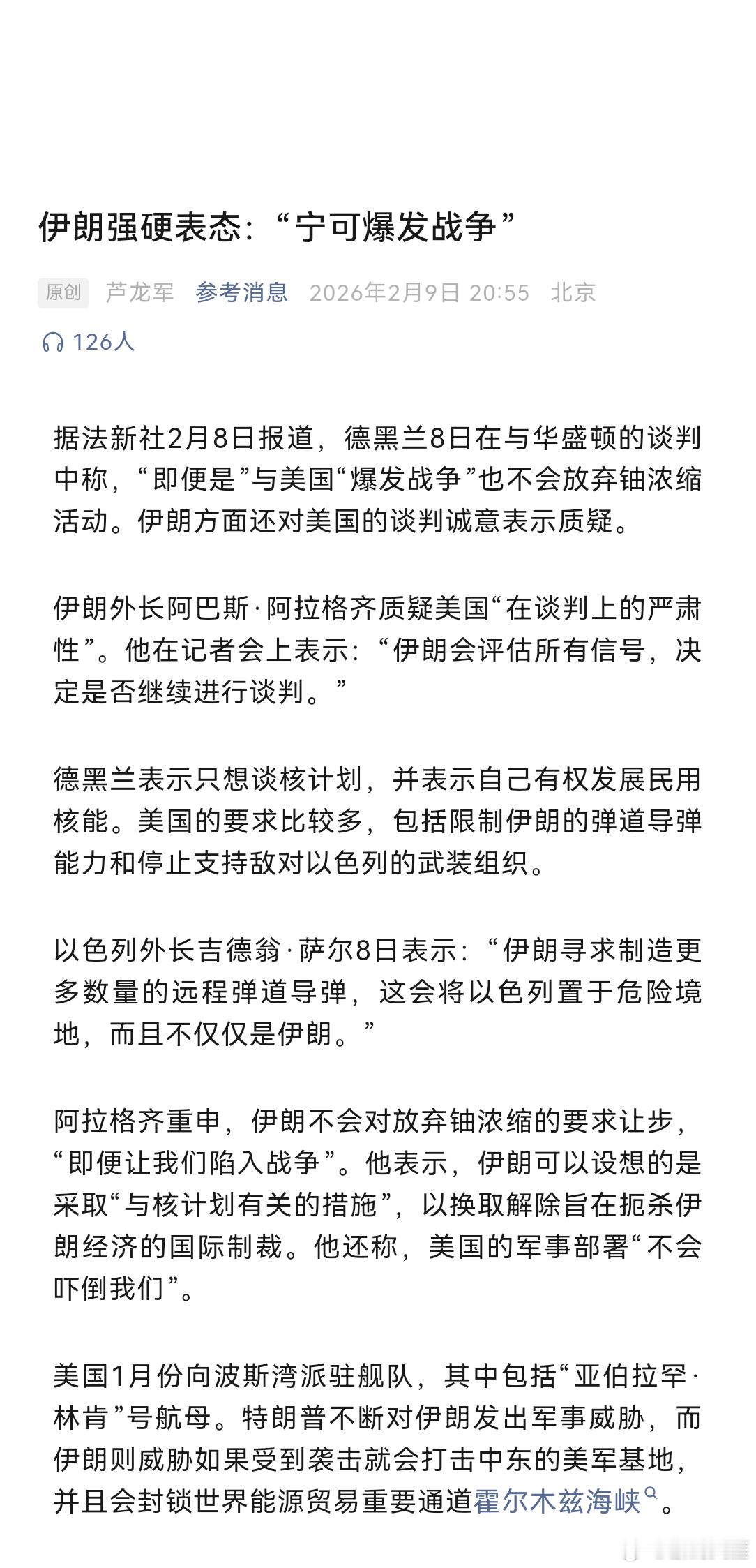 据法新社2月8日报道,德黑兰8日在与华盛顿的谈判中称,“即便是”与美国“爆发战争”也不会放弃铀浓缩活动。伊朗方面还对美国的谈判诚意表示质疑。