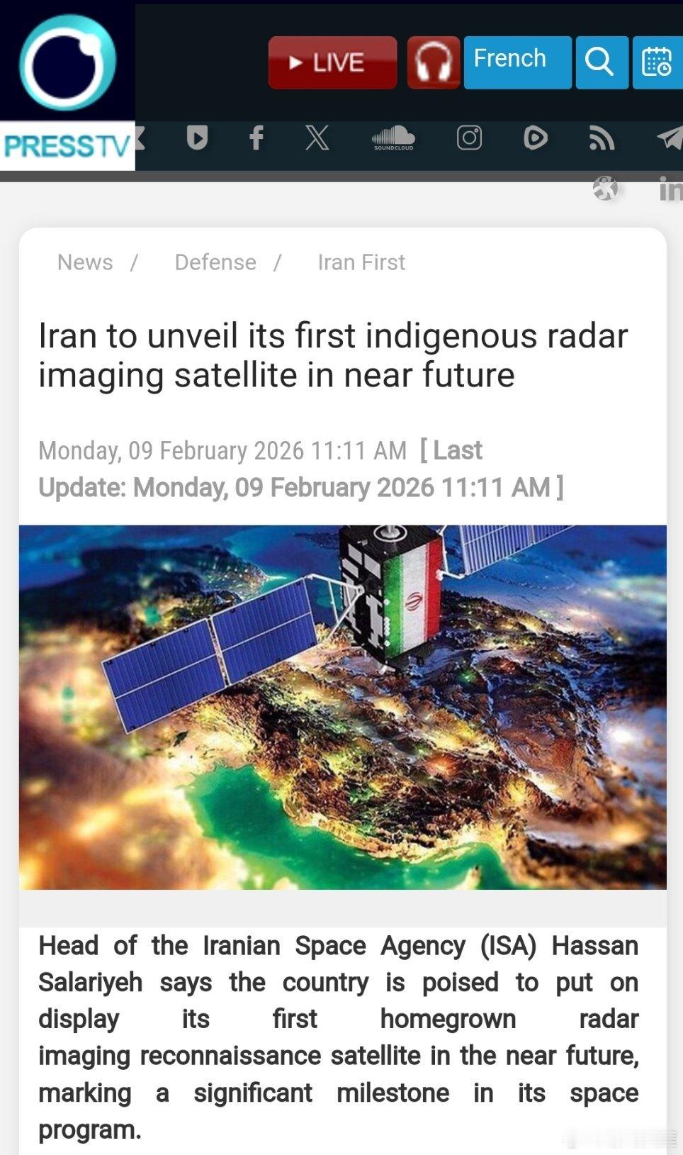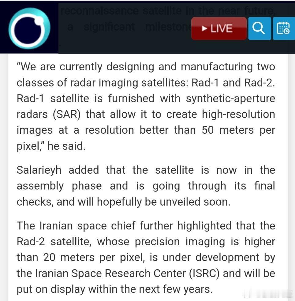 伊朗航天局(ISA)局长哈桑·萨拉里耶表示,该国即将展示其首颗自主研发的雷达成像侦察卫星,这标志着其太空计划迈出了重要一步。(伊朗官网)