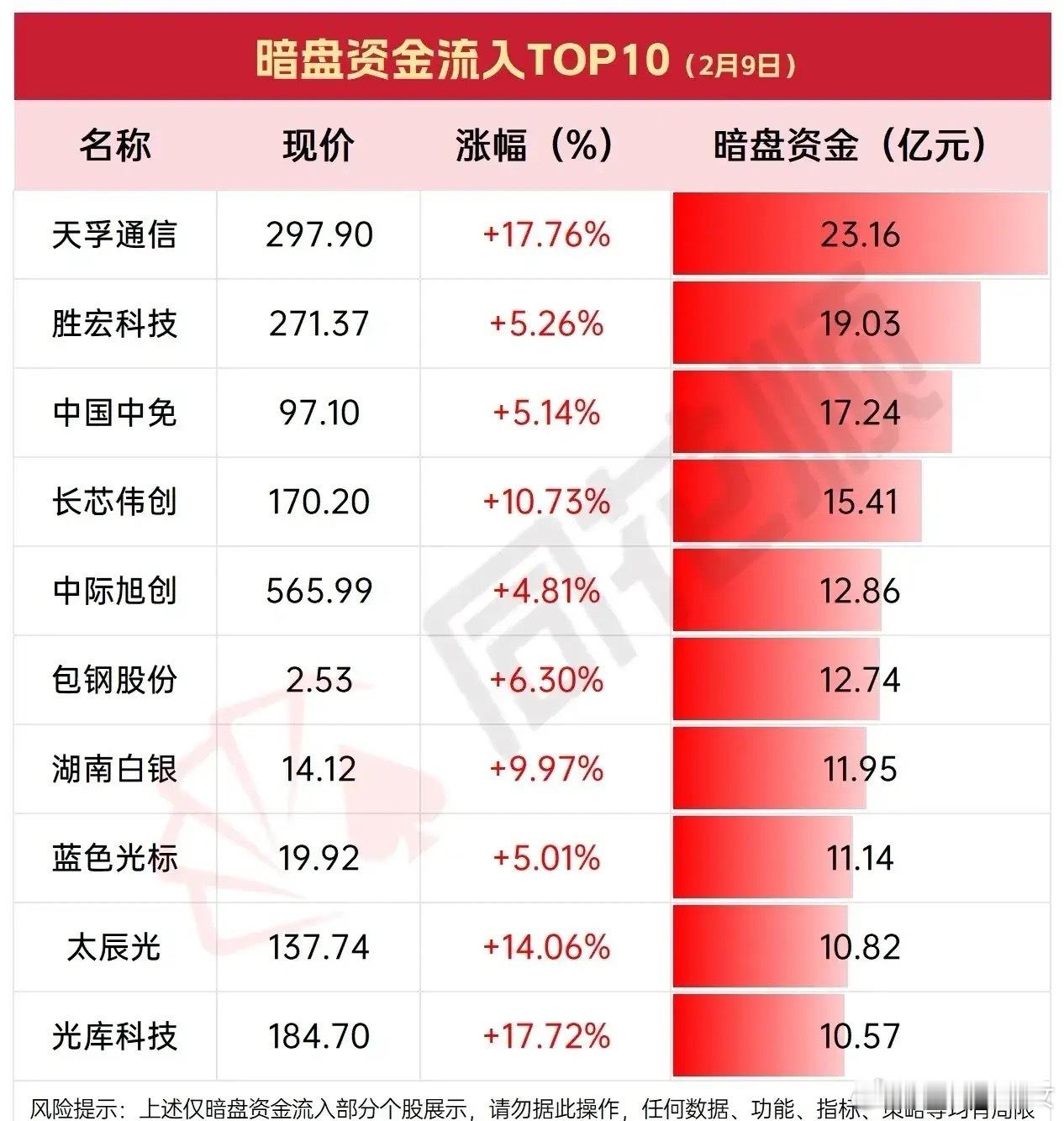 今日暗盘资金流向呈现明显分化:流入TOP10个股以光模块、半导体等科技板块为主,同时覆盖消费、周期等领域,多数个股伴随股价上涨,资金集中布局高景气赛道;流出TOP10则涵盖能源、电子、基建等板块,部分个股虽有小幅上涨但资金仍呈净流出,反映市场资金在热点板块集中布局的同时,对部分标的存在调仓或获利了结行为。个股梳理分析1. 天孚通信:主营光通信器件研发生产,2月9日暗盘资金流入23.16亿元,当日股价上涨17.76%,现价297.90元,是本次暗盘资金流入规模最大的个股。2. 胜宏科技:主营印制电路板制造,当日暗盘资金流入19.03亿元,股价上涨5.26%,现价271.37元,在电子制造板块中资金关注度较高。3. 中国中免:主营免税品销售,暗盘资金流入17.24亿元,股价上涨5.14%,现价97.10元,是消费板块中资金流入较为突出的标的。4. 长芯伟创:从事半导体设备相关业务,暗盘资金流入15.41亿元,股价上涨10.73%,现价170.20元,科技属性个股获资金青睐。5. 中际旭创:主营光模块产品,暗盘资金流入12.86亿元,股价上涨4.81%,现价565.99元,为光通信产业链核心标的之一。6. 包钢股份:主营钢铁、稀土相关产品,暗盘资金流入12.74亿元,股价上涨6.30%,现价2.53元,是低价周期股中获资金流入的标的。7. 湖南白银:从事白银等贵金属相关业务,暗盘资金流入11.95亿元,股价上涨9.97%,现价14.12元,贵金属板块个股表现活跃。8. 蓝色光标:主营广告营销服务,暗盘资金流入11.14亿元,股价上涨5.01%,现价19.92元,是传媒板块中资金流入靠前的个股。9. 太辰光:主营光通信传感设备,暗盘资金流入10.82亿元,股价上涨14.06%,现价137.74元,为光通信细分领域标的。10. 光库科技:从事光无源器件研发,暗盘资金流入10.57亿元,股价上涨17.72%,现价184.70元,是光模块产业链相关个股。11. 洲际油气:主营石油勘探开发,2月9日暗盘资金流出4.16亿元,当日股价下跌1.82%,现价5.40元,是本次暗盘资金流出规模最大的个股。12. 银河电子:主营智能机电设备,暗盘资金流出3.57亿元,股价下跌0.95%,现价9.43元,电子设备板块个股资金呈流出状态。13. 京东方A:主营显示面板制造,暗盘资金流出3.23亿元,股价下跌0.46%,现价4.35元,是面板行业龙头中资金流出的个股。14. 盛屯矿业:主营有色金属采选,暗盘资金流出3.22亿元,股价下跌1.88%,现价15.63元,为有色金属板块中资金流出的标的。15. 中国中铁:主营基建工程建设,暗盘资金流出2.84亿元,股价微涨0.18%,现价5.52元,基建板块个股虽上涨但资金流出。16. 世纪华通:主营游戏、汽车零部件业务,暗盘资金流出2.83亿元,股价下跌2.63%,现价19.28元,多元业务个股资金呈流出状态。17. 浙文互联:主营数字营销服务,暗盘资金流出2.81亿元,股价下跌1.36%,现价13.81元,是传媒板块中资金流出的个股。18. 利欧股份:主营泵业及数字营销,暗盘资金流出2.72亿元,股价上涨2.60%,现价8.68元,个股上涨但资金仍呈流出状态。19. 平潭发展:主营林业及基建业务,暗盘资金流出2.69亿元,股价下跌1.29%,现价11.47元,综合类个股资金呈流出状态。20. 捷佳伟创:主营光伏设备制造,暗盘资金流出2.28亿元,股价上涨1.52%,现价134.63元,光伏板块个股上涨但资金流出。总结今日暗盘资金流向反映出市场结构的分化特征:资金在光模块、半导体等科技高景气赛道及消费、周期板块集中布局,推动相关个股上涨;同时,部分能源、电子、基建类个股出现资金流出,即使个股上涨也未能留住资金,体现出当前市场资金在热点板块聚焦的同时,对部分标的存在调仓需求。本文涉及资讯、数据等内容来自网络公共信息,仅供参考,不构成投资建议!