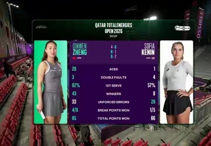 本场比赛,郑钦文轰出20记ACE,对手肯宁全场仅1记ACE。