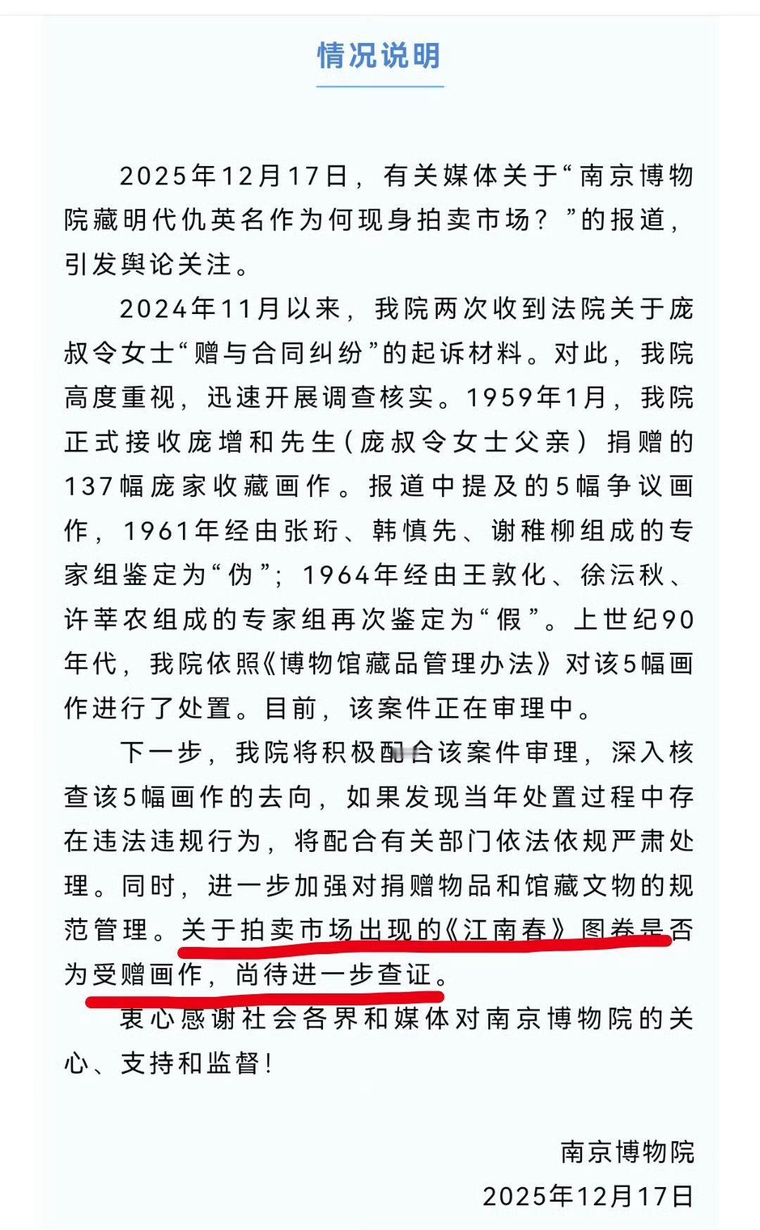 南京博物院道歉——2025年12月17号的情况说明中还在表示“按照博物馆藏品管理