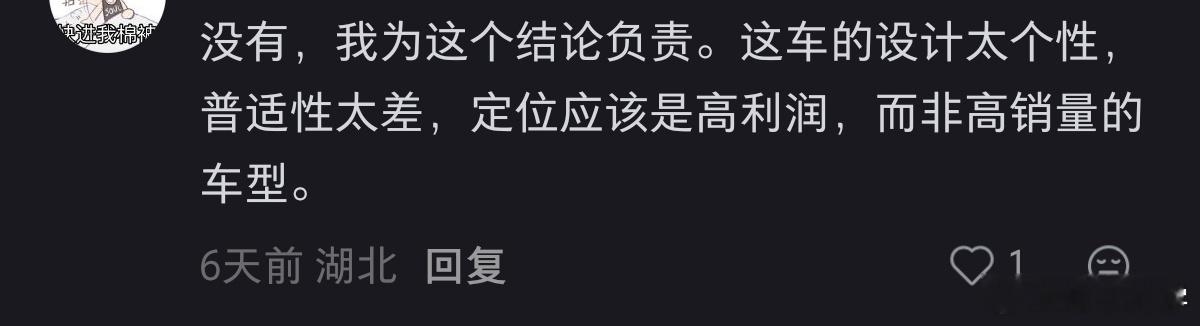 有人问阿维塔06T有爆的潜质吗?然后我看到底下回复说:阿维塔的设计太过个性,是普适性不佳。