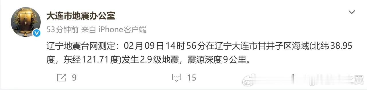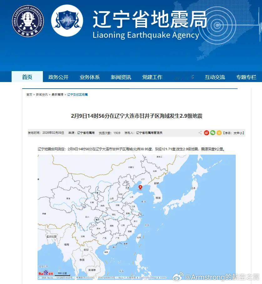 大连地震 辽宁地震台网测定,北京时间2026年2月9日14时56分,大连市甘井子区大连湾海域(北纬38.95度,东经121.71度)发生2.9级地震,震源深度9千米。