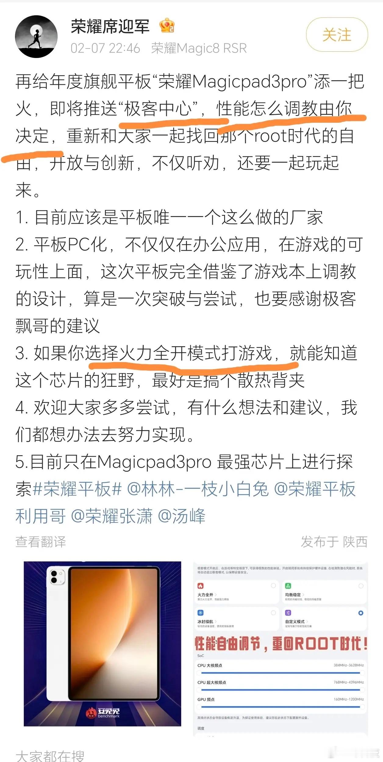 荣耀这一招直接亮出“王牌”!最新推出的荣耀MagicPad3 Pro,率先搭载创新性的“极客模式”,这是让性能调度权交还用户,而且还会从平板延生到手机,感觉WIN系列应该是最先应用的。