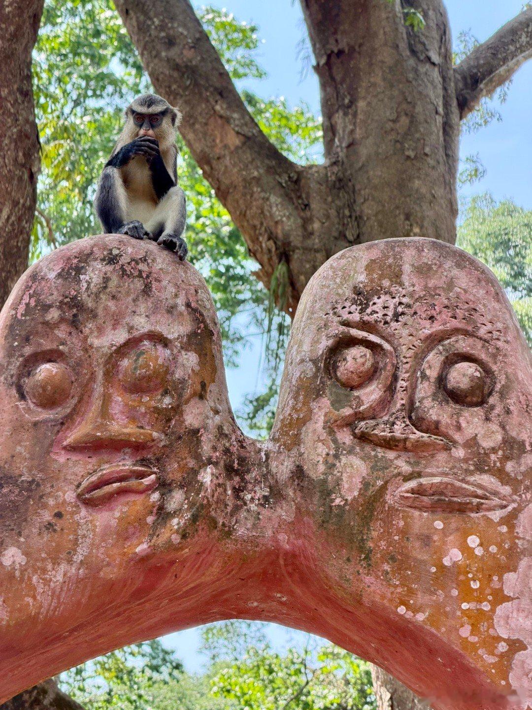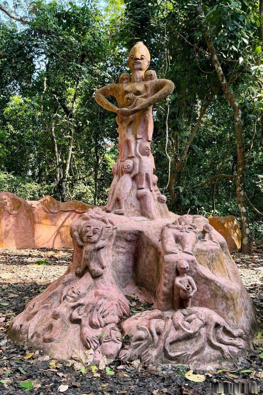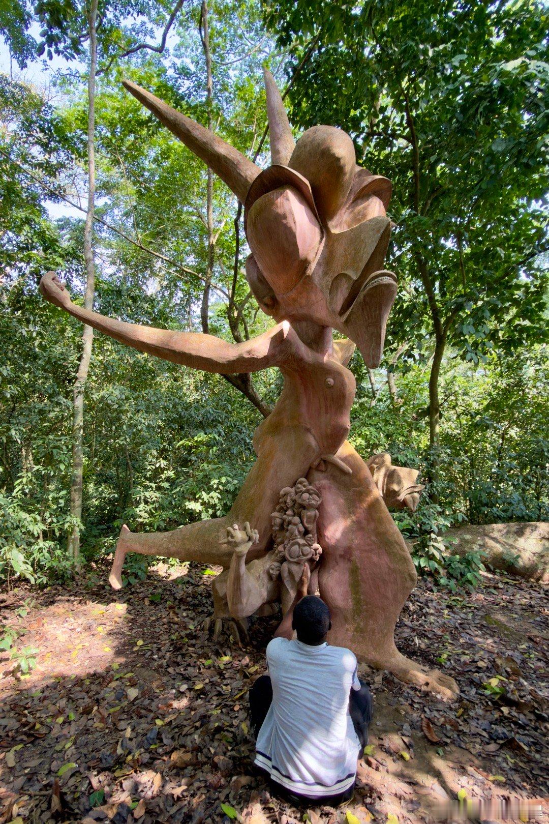 1950年代,奥地利女艺术家Suzanne Wenger被本地祭司接纳,成了约鲁巴文化的女祭司,她发起了“新神圣艺术运动”,用水泥、铁、回收材料修复破损神龛、宫殿,并在森林中创作了40多座大型雕塑与建筑,如巨型拱门、鸟形神龛、蛇形桥、拟人化宫殿入口等,这些作品融合了古代神话与现代抽象艺术,形成的雕塑森林既保护了物质遗产,又复兴了精神传统,就是外星人风格太浓厚了。