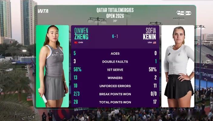 郑钦文次盘火力全开6-1肯宁双方1-1决胜盘见分晓中国网球郑钦文郑钦文vs肯宁