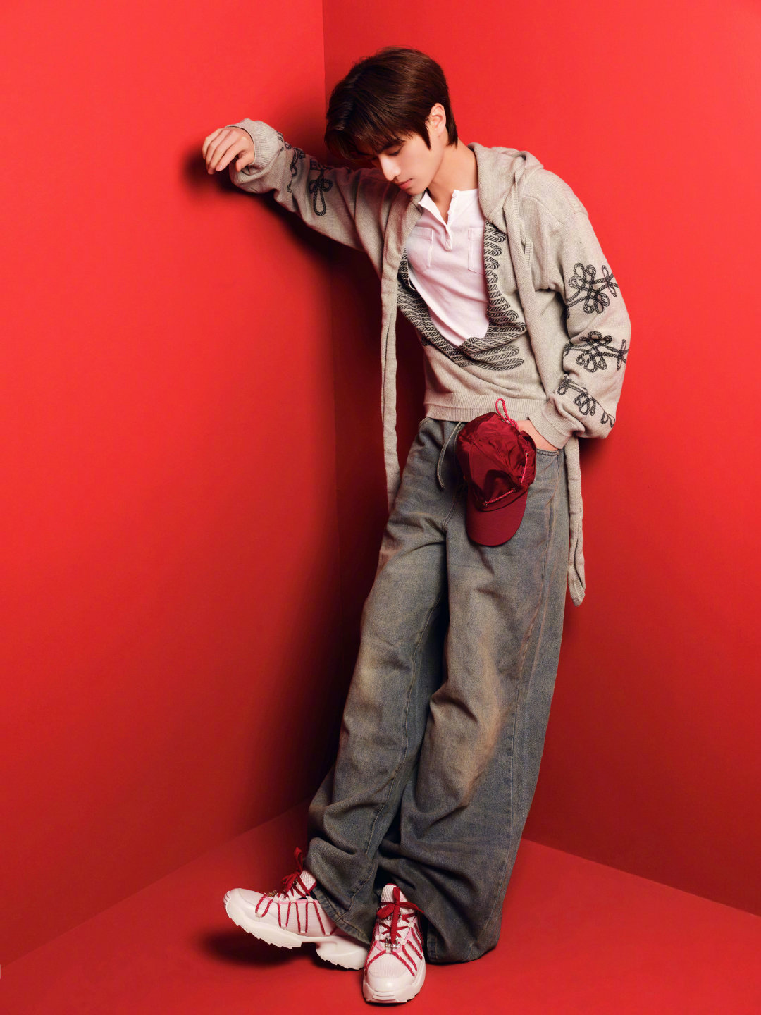 张康乐 RV品牌挚友演绎的新春大片,针织装配牛仔裤,运动鞋加棒球帽,红白撞色交织,俊朗型格魅力。风格大赏 时尚灵感解读