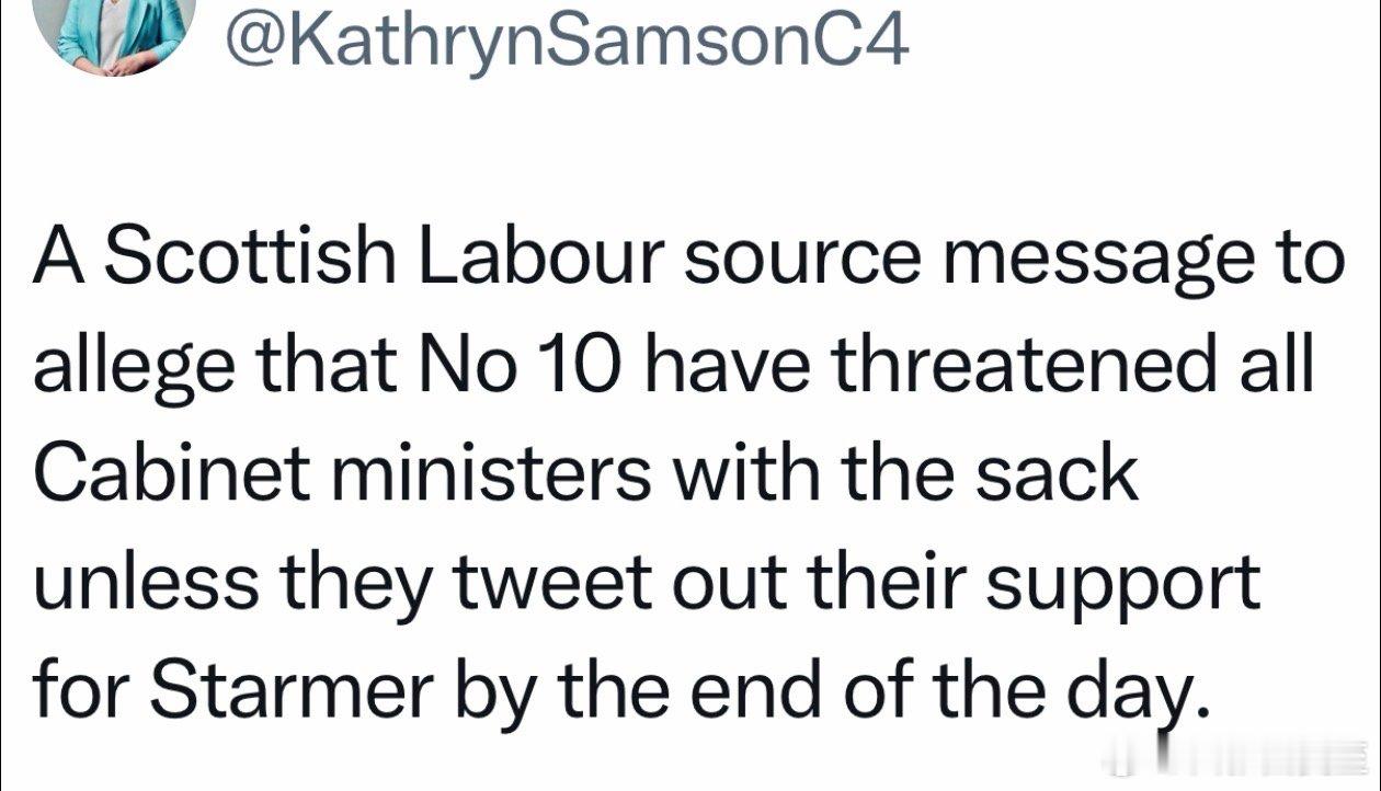 苏格兰记者:据苏格兰政客提供的消息,唐宁街十号要求内阁成员今天在社媒上公开表态“支持首相”,否则会被解职