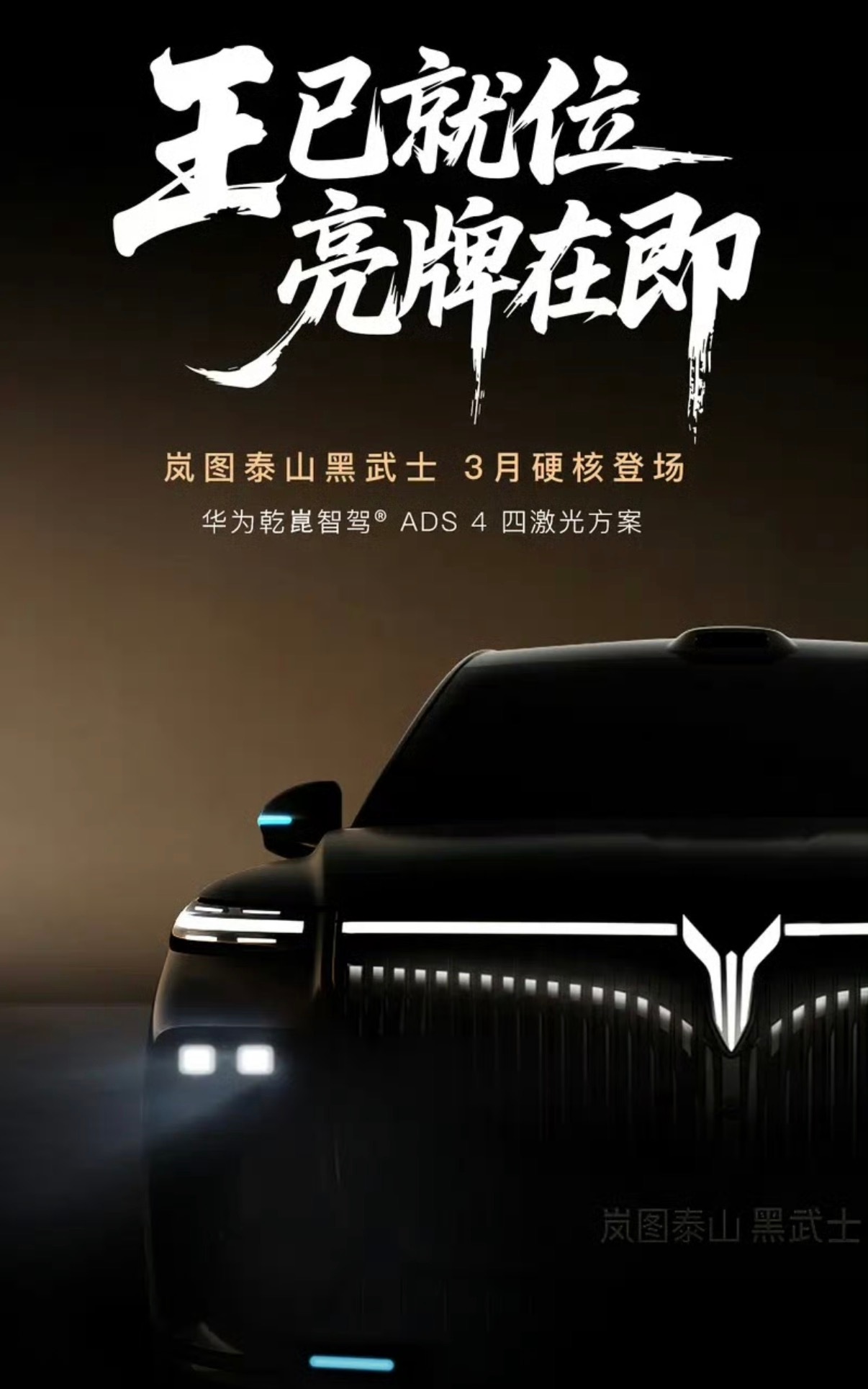 【岚图泰山黑武士版预告图 将于3月上市】2月9日,岚图汽车CBO、销售公司总经理邵明峰在微博上发布了一张岚图泰山黑武士预告图,并表示,岚图泰山黑武士,就是3.0阶段的扛旗之作。据介绍,岚图黑武士将搭载华为乾崑智驾ADS 4四激光方案,配合全车34颗高精度传感器,拥有强大的感知能力。同时,新车还拥有制动/转向/电器等多项冗余的安全配置。此外,岚图泰山黑武士版还搭载6个智驾小蓝灯、车外麦克风等。岚图