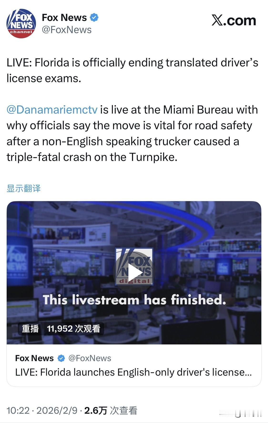 从 2026 年 2 月 6 日起,佛罗里达州正式开始仅以英语进行所有驾照考试。 佛罗里达州公路安全与机动车管理局(FLHSMV)宣布,全州范围内的所有驾照类别(包括标准 Class E 和商业驾照 CDL)的笔试、口试及路考均转为纯英文模式。 政策核心变化 取消翻译服务:考试过程中严禁使用语言翻译服务、翻译设备或私人口译员。 移除多语种试卷:所有非英语版本的纸质及数字化考试系统均已移除。此前,非商业驾照考试曾提供西班牙语、海地克里奥尔语等多种语言选择。 例外情况:美国手语(ASL)仍被允许用于英文沟通。 过渡期:迈阿密-戴德县等部分地区为 2 月 6 日前预约的考生提供了截至 3 月 31 日的 60 天过渡期,期间仍可选择西班牙语考试。 实施背景与目的 该政策的转变主要源于对道路安全的考虑。州政府官员,包括州长罗恩·德桑蒂斯(Ron DeSantis),强调驾驶员必须能够看懂英文路标和交通指示。 导火索案件:2025 年 8 月,一名不通英语的卡车司机 Harjinder Singh 在佛罗里达收费公路上因违规掉头导致一起三人死亡的惨烈事故。调查发现该司机无法理解英文路标,且在事故后的英语水平测试中未能达标。 官方立场:FLHSMV 表示此举旨在通过确保清晰的沟通和对交通法规的理解来提升道路安全性。 这项政策在佛罗里达州引发了激烈辩论。支持者认为这保障了公共安全,而批评者(如佛罗里达州民主党主席 Nikki Fried)则认为这在多语种社区中构成了歧视和不必要的准入障碍。