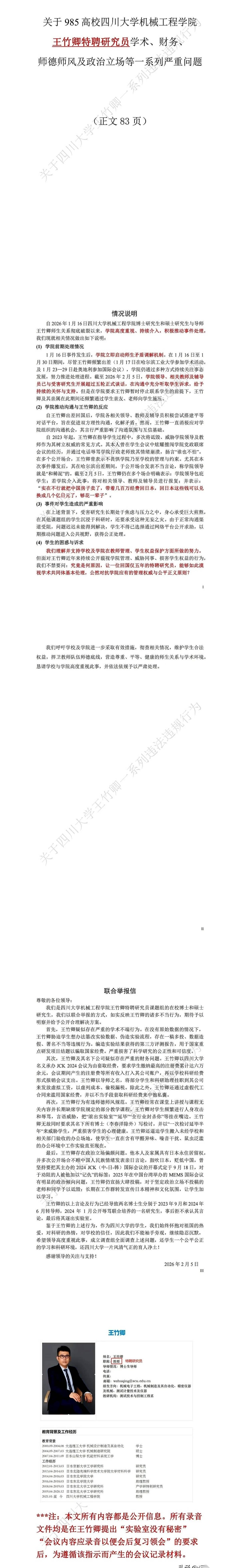 四川大学那个王竹卿的事,真是越听越不对劲。 一个在日本待了13年的人,疫情期间作为人才被引进回国,手握几百万的经费,结果转头就敢在学校里放话:谁要是惹我,我就卷着钱回日本! 这话一出来,性质就全变了。 办公室里,同事在他嘴里成了可以随意辱骂的对象。课堂内外,学生被他恐吓得战战兢兢。他把学校的规章制度当成废纸,把国家的科研经费当成自己的私人筹码,随时准备打包带走,头也不回地跑路。 这已经不是简单的狂妄和没品了。 很多人都在琢磨,他当初在日本是不是混不下去了?还是回来本就带着别的任务?这些话的底气,到底是从哪来的? 一个细节是,他经常以“学术交流”的名义频繁出入国内外。 现在大家最担心的,就是不能让他跑了。这种人一旦脱身,很可能摇身一变,成为第二个在海外拿着我们的资源反过来抹黑我们的“石平”。 把他开除了事,那是最简单,也是最没用的处理方式。 真正该掰扯清楚的是,当初是谁拍板让他进来的?引进人才的流程,到底漏掉了哪一阵风?这个门,以后该怎么焊死?