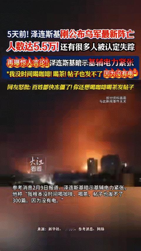 2026年2月9日,泽连斯基在接受采访时提到,因为全国停电,他每天连三百条推文都发不出,一杯咖啡也喝不上,这话很快在网上引起争论,大家不怎么关心总统的处境有多难,反而更想问:你没电发帖子,我们没电取暖,到底谁更不容易过,基辅和哈尔科夫这些城市,一天要停电八到十二个小时,四成发电厂被炸毁,医院的重症监护室断电、暖气停供、自来水也时有时无,红十字会送来了发电机,但数量太少,根本不够分,有人在社交平台上回应说,总统的咖啡机没电用,可我们的暖气片是真的冰凉了,这句话听起来像玩笑,其实讲的是实情——不是抱怨日子难过,而是基本的生存条件都没了。 2月4日泽连斯基首次公开确认阵亡人数达到5.5万,之前公布的数字是3.2万,这次新增两万多,他解释这是根据前线最新战报更新的,主要来自顿巴斯地区的拉锯战,国外有人怀疑实际数字可能更高,但乌克兰民众反应更为强烈,网上许多人质疑用5.5万人生命换来的结果却连冬季供电都无法保障,许多失踪士兵家属开始组织抗议活动,举着照片站在政府门口要求公布姓名、地点和遗体下落,他们不接受“失联”这种说法,认为这是官方推卸责任的借口,数字本身并不重要,重要的是国家是否认真对待每一条生命。 总统说自己没有时间,老百姓却认为他没有资格,官员们在烛光下商量办法,护士们摸黑接生孩子,总统的推文发不出去,妈妈抱着孩子在零下二十度的屋里等待天亮,这不是比谁更苦的问题,而是整个社会都乱套了,国家还在打仗、搞外交、签文件,可普通人连热水都烧不上,政府既没说为什么停电这么久,也没告诉什么时候能恢复,人们的信任就这样慢慢耗尽了。 这次突然公布伤亡数字,时间点选得很巧,正好赶上美国和欧洲在讨论要不要继续援助乌克兰,北约内部对制裁俄罗斯也有不同意见,乌克兰这边把数字放出来,是想让国内人知道他们真的拼了,同时告诉西方再不加把劲就撑不住了,俄罗斯没有公开回应,但战线确实在慢慢向扎波罗热和赫尔松方向移动,春天可能又要打一场大仗,能源和伤亡现在成了判断这场战争能不能继续的关键指标。 还有很多人没留意到这件事,年轻人开始把停电的日子当作纪念日,他们不拍军功章的照片,却记录黑暗中的蜡烛、结冰的窗台、孩子画出的“爸爸在哪”的涂鸦,这些画面没有响亮口号,也没有英雄故事,只是平常日子被撕开的样子,仗打久了,人们记住的不再是胜利或牺牲,而是某个晚上灯突然熄灭,孩子问妈妈我们家的灯还会不会亮,这样的记忆没法刻在纪念碑上,只能存在手机相册里,等到哪天来电了,再翻出来看看。 不知道您对此有什么看法呢?欢迎在下方评论区留下你的想法,喜欢文章记得点赞关注我们下期再见。