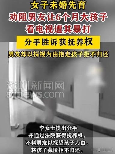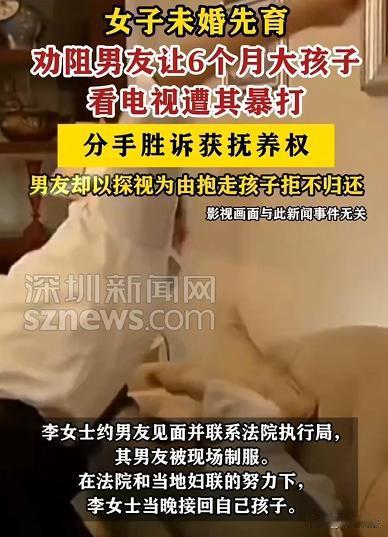 河南许昌,李女士未婚先孕生下女儿,男友竟给6个月大的女儿看电视,李女士劝阻遭男友暴打,还打孩子。李女士分手后通过法院拿到抚养权,男友哄骗见面后将孩子藏起并要挟。李女士不再心软,找记者、法院和妇联帮忙约男友见面,面对拿孩子要挟的男友,法院执行人员果断出手,最终帮李女士接回女儿。男友行为恶劣,对婴儿挥拳,是家暴更是自私无能。 据红星新闻、深圳新闻网报道,李女士,估计肠子都悔青了,咋就碰上这么个不靠谱的男友!恋爱时未婚先孕,生下个可爱闺女,可这日子却越过越糟。 孩子才6个月大,可是啥都不懂,需要精心呵护的阶段。 可李女士的男友,也不知道脑子咋想的,竟然把孩子抱到电视机前,让这么小的娃看电视。 李女士看到后,赶紧上前劝阻:孩子这么小,看啥电视,对眼睛多不好。 可她这话刚一出口,男友瞬间炸了毛。他瞪大眼睛,恶狠狠地盯着李女士吼道:你懂个屁,我看电视咋啦,孩子看看也没事。 李女士还想再解释几句,男友却直接冲过来,对着她就是一顿拳打脚踢,这还不算完,他竟然还把气撒到了孩子身上,对着孩子也挥起了拳头。 李女士当时就懵了,她怎么也没想到,眼前的这个男人,竟然会变成这个样子,她看着哇哇哭的孩子,再看看眼前这个男人,心彻底凉了,决定和这个男人分手。 分手后,李女士通过法院拿到了孩子的抚养权,可她还是太天真了,那个渣男友,根本就没打算放过她们。 有一天,男友突然给李女士打电话说:我想孩子了,咱们见个面,让我看看孩子吧。 李女士一开始还有点犹豫,毕竟这男人之前的行为太恶劣了,可她又想到,孩子也需要父爱,也许见面后他能改,于是就答应了。 见面那天,李女士带着孩子去了约定的地方,男友一看到孩子,眼睛里闪过一丝狡黠的光。他走上前,抱起孩子,嘴里说着一些甜言蜜语。 可李女士还没反应过来,男友突然抱着孩子就跑了,李女士一下子就慌了神,她一边追,一边喊:你把孩子还给我,你这个混蛋。 可男友跑得飞快,很快就消失在她的视线了。 紧接着,李女士就接到了男友的电话,男友说:想要孩子,你就得听我的,不然,这辈子你都别想见到孩子。 李女士怎么也没想到,这个男人竟然会拿孩子来要挟她。 这一次,李女士没有再心软,她知道,靠自己的力量,根本没办法把孩子要回来。 于是,她找到了记者,把事情的来龙去脉都告诉了记者。 记者听了,也很气愤,决定帮她一起讨回公道。 李女士还向法院和妇联寻求帮助,法院和妇联的工作人员非常重视这件事,他们也制定了详细的计划,他们约男友再次见面,男友以为李女士还是像以前一样好欺负,就大大咧咧地来了。 见面的时候,男友还是那副嚣张跋扈的样子,手里还紧紧抱着孩子,他以为,有孩子在手里,李女士和法院的人都不敢把他怎么样。 可他错了,法院执行人员早就做好了准备,就在男友还在得意的时候,执行人员突然冲上前,一把将他制服。 男友还挣扎着说:你们敢动我,我让你们好看。 可执行人员根本不理会他,迅速从他手里抱过了孩子。 李女士看到孩子被安全地抱了回来,她紧紧地抱着孩子,嘴里不停地说:宝贝,妈妈以后再也不会让你受苦了。 这男友的行为,实在是让人愤怒,他不仅对婴儿挥拳,这是家暴,更是自私无能的表现,他拿孩子当工具,来满足自己的控制欲,这种人,根本就不配当父亲。 李女士男友的行为可谓劣迹斑斑,他给6个月大婴儿看电视,劝阻后暴打李女士和孩子,这明显构成家庭暴力。 依据反家庭暴力法,家庭暴力是指家庭成员之间以殴打、捆绑、残害等方式实施的身体、精神等侵害行为,他这种行为严重侵害了李女士和孩子的身心健康,应受到批评教育、警告等处罚,若造成严重后果,还可能面临行政拘留。 李女士拿到抚养权后,男友哄骗见面藏起孩子要挟,这属于拒不执行判决、裁定行为。 依据刑法,对人民法院的判决、裁定有能力执行而拒不执行,情节严重的,处三年以下有期徒刑、拘役或者罚金。他拿孩子当筹码,公然挑战法律权威,必须受到严惩。 找对象真的得擦亮眼。不能光看对方的外表和甜言蜜语,更要看他的人品和责任心,不然,遭罪的不仅是自己,还有无辜的孩子。 那么,对于这样的渣男,除了道德上的谴责,还能做些什么来保护自己和孩子呢?对此,你怎么看?