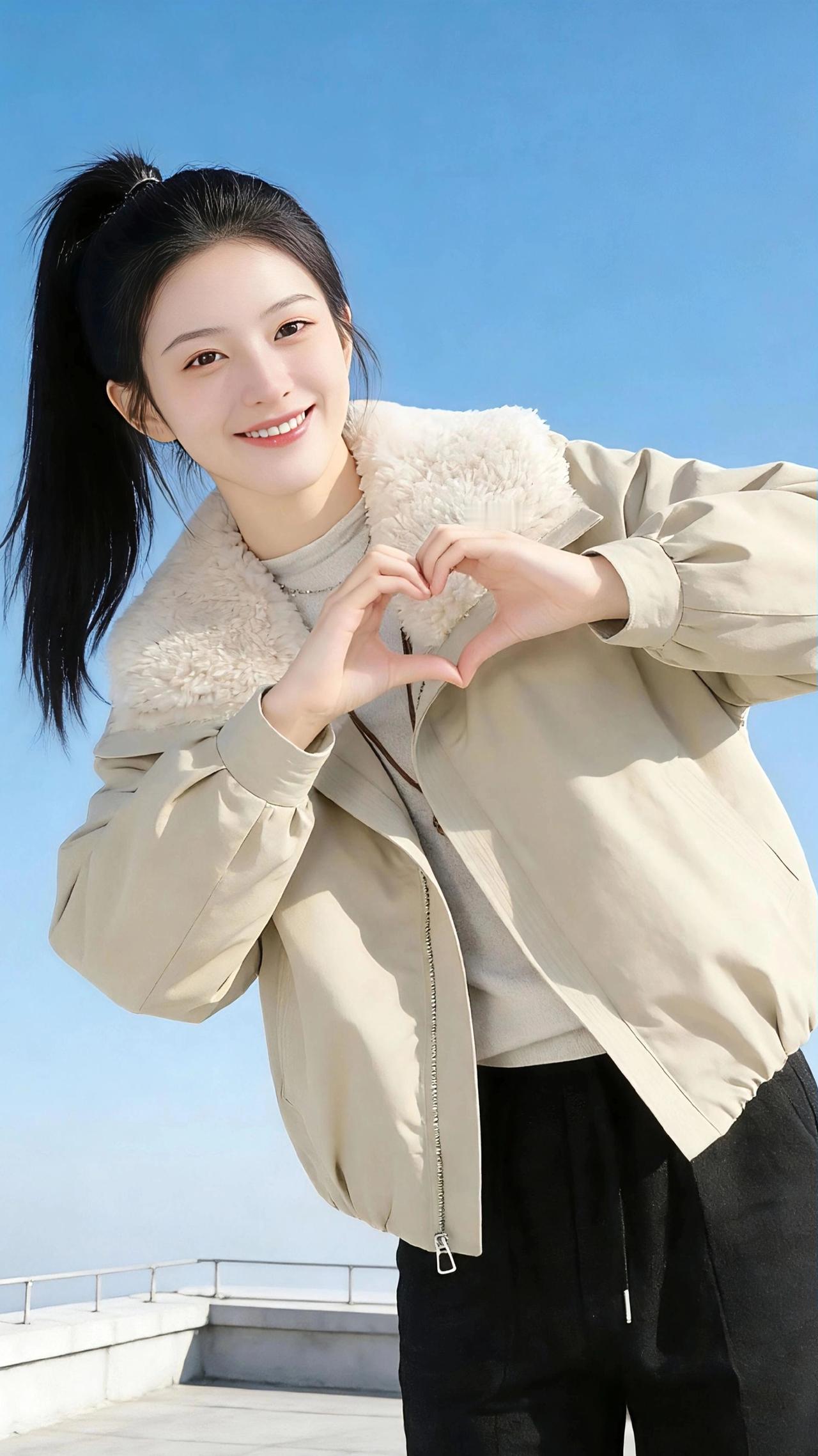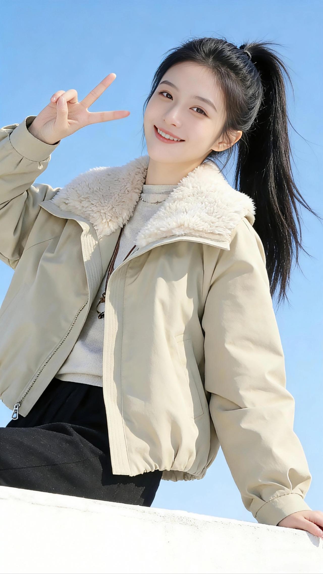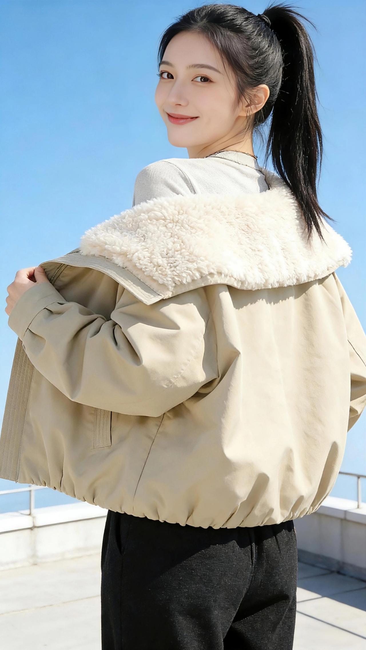 风从海面漫上来,带着咸湿的气息,拂过她高扎的马尾,也拂过那件浅卡其色的短款夹克。 毛领蓬松柔软,像冬日里最后一团未化的雪,裹着她的颈间,也裹着几分恰到好处的慵懒。她站在天台的边缘,身后是澄澈如洗的蓝天,没有一丝云絮,干净得像少年时的心事。 她偶尔回头,指尖轻轻撩开夹克的拉链,露出内里浅灰针织衫的细腻纹理;又或是对着镜头比出一个俏皮的“V”,笑意漫过眼尾,像阳光落在海面,碎成粼粼的波光。 风把她的发梢吹得轻扬,她便伸手捻起一缕,绕在指尖,眼神里是藏不住的明媚。有时双手交叠在胸前,比出一颗心的形状,仿佛要把这片刻的晴朗,妥帖地收进掌心;有时又将双手插进夹克的口袋,微微仰头,让风灌满衣摆,整个人像一只即将振翅的鸟,轻盈又自由。 这件夹克是冬日里的温柔注脚,不厚重,却足够抵御海风的凉意;不张扬,却在每一处褶皱里藏着青春的张力。它陪着她在天台看海,看云,看自己的影子被阳光拉得很长,也陪着她把那些细碎的欢喜,一一妥帖安放。 风还在吹,她的马尾在风里晃,像一首未完的诗。而那件浅卡其色的夹克,就那样静静裹着她的体温,裹着一整个冬天的晴朗与心动。 高级感穿搭 新年穿搭 冬季穿搭 派克服