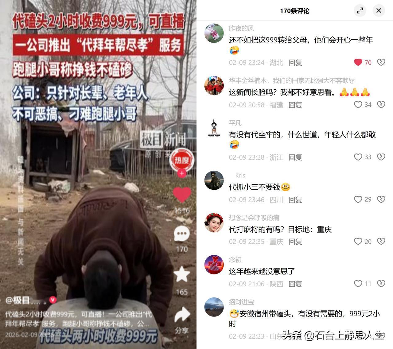 代磕头要999元,真有人买? 最近有平台推出代拜年服务,最贵一档999元,包含代磕头、送年货、直播全程,居然已经有几十单成交。这事儿看着荒唐,倒也折射出了不少人的难处。 过年回不去家的异地青年,一边扛着不孝的隐形压力,一边被车票、加班绊住脚,这份尽孝焦虑,催生出了明码标价的情感代偿。可磕头本来是晚辈发自真心的礼数,现在变成跑腿小哥按流程完成的任务,到底是帮人尽孝,还是把传统情谊拆成了标准化的商品? 有人说不如直接把钱打给父母,这话糙理不糙。孝心从来不是做给别人看的表演,那些隔着屏幕的程序化磕头,到底暖了谁的心? 你会为这种情感套餐买单吗?