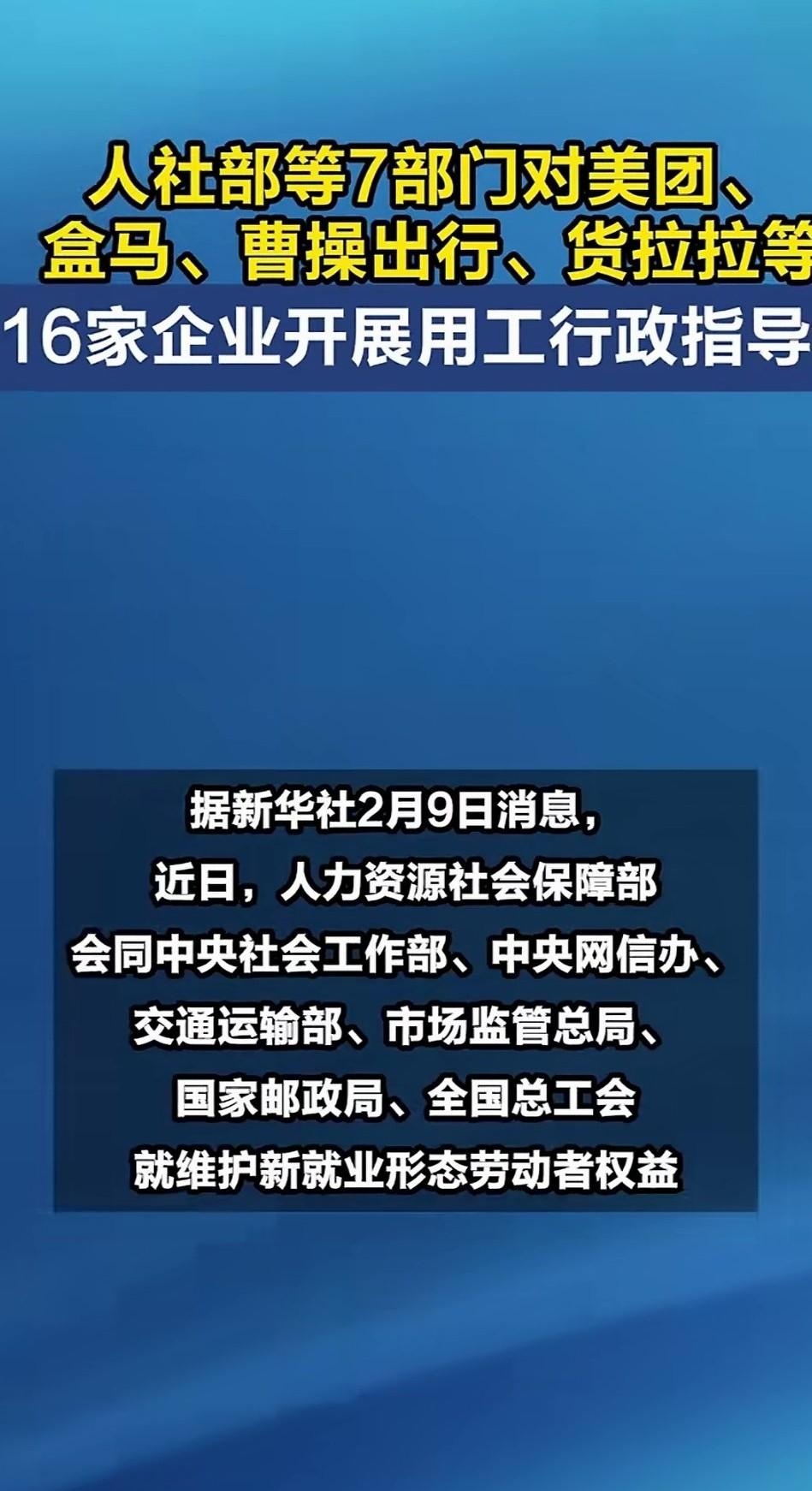 国家七部门重拳出击!16家平台被约谈,2000万灵活就业者的权益终于有救了? 我发现,我们每天点的外卖、收的快递、叫的网约车,背后都是2000万灵活就业者的汗水。 他们在寒风里抢单,在暴雨中狂奔,却常常面临“多劳不多得、出事没人管”的困境。 今天,七部门的一纸行政指导,终于为他们撑起了一把“保护伞”。 一、雷霆出击!16家头部平台被集中约谈 2026年2月9日,人力资源社会保障部会同中央社会工作部、中央网信办、交通运输部、市场监管总局、国家邮政局、全国总工会,对美团、淘宝闪购、京东秒送、滴滴、T3出行、货拉拉、圆通速递、申通快递等16家头部平台和快递企业开展了用工行政指导。 这不是一次简单的会议,而是一次精准“点名”。 覆盖了即时零售、网络出行、同城货运、快递配送四大领域,几乎把我们手机里常用的App都囊括了进来。 二、核心要求:平台要真正“负起责” 七部门的要求,直指平台用工的痛点: 压实主体责任:明确平台是用工责任的第一责任人,不能再用“外包”“合作”等名义甩锅。 优化算法机制:严禁通过“最严算法”逼迫骑手超时,要合理设置配送时长和考核标准。 保障劳动权益:推动平台为骑手、司机等购买工伤保险,畅通劳动争议维权渠道。 畅通诉求表达:建立常态化沟通机制,让劳动者的声音能被听到,而不是被算法淹没。 简单说,就是要让平台从“逐利优先”转向“以人为本”,让灵活就业者不仅能赚到钱,更能有尊严、有保障地工作。 三、这对我们意味着什么? 对于每天奔波在路上的骑手和司机来说,这意味着: 不再为了几毛钱的超时罚款,在红灯前铤而走险。 万一发生交通事故,有工伤保险托底,不用独自承担巨额医疗费用。 遇到不公平待遇时,有地方说理,有工会撑腰。 对于整个行业来说,这意味着平台经济的野蛮生长时代结束了。只有规范发展,才能走得更远。 灵活就业不是“裸奔”,劳动者权益不能“悬空”。 你身边有做外卖骑手、快递员或网约车司机的朋友吗?他们最关心的权益问题是什么?你觉得这次七部门的行动,能真正改变他们的处境吗? 欢迎在评论区聊聊,为我们身边的“城市摆渡人”发声。 (内容取材网络) 点亮〔收藏和赞〕让健康和爱都流向你