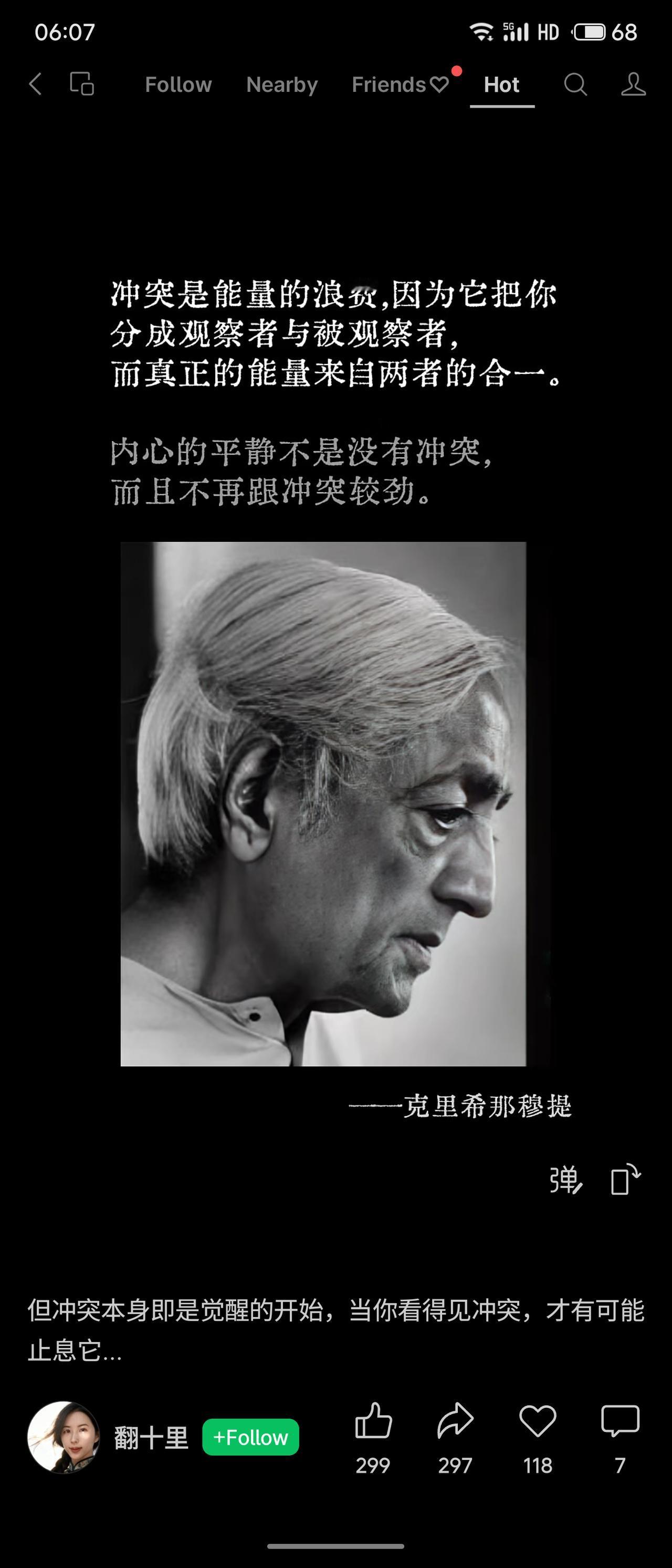 克里希那穆提指出,冲突会让人分裂为观察者与被观察者,消耗能量;真正的能量源于两者的合一。内心平静并非没有冲突,而是停止与之对抗。同时,冲突也是觉醒的开始,只有觉察到它,才可能止息。