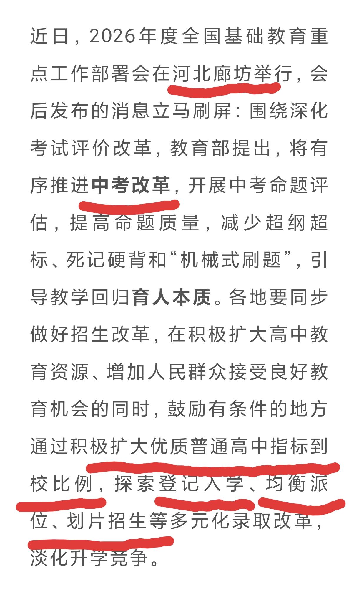 各地中考又要改革了!在京津走廊河北廊坊举行的全国基础教育重点工作部署会上,明确了中考要改革这件事。 2026年及以后,中考要变天了,简单说就是“不卷分数,要卷素质”。 核心变化就两点: 1. 考试变“活”了:以后中考题会减少死记硬背和机械刷题,更侧重考察孩子的理解能力和解决实际问题的能力。这意味着光靠“题海战术”可能拿不到高分了。 2. 录取变“宽”了:为了淡化升学竞争,政策鼓励扩大“指标到校”比例,并探索登记入学、划片招生等新方式。简单理解就是,家门口的好学校名额变多了,孩子上好高中的机会更大了。 家长们也不要慌,这其实是在给孩子们“减负”,把教育拉回“育人”的本质。以后孩子不用再为了那几分拼命刷题,可以把更多精力放在培养独立思考和综合素养上,这对孩子的长远发展其实是件好事。 条条大路通罗马,多培养一些冬奥会冠军苏翊鸣这种人才,不是很好吗?不要去卷分数卷学历,让孩子的特长得到发挥并能作为一种技能养家糊口,这是最好的选择。