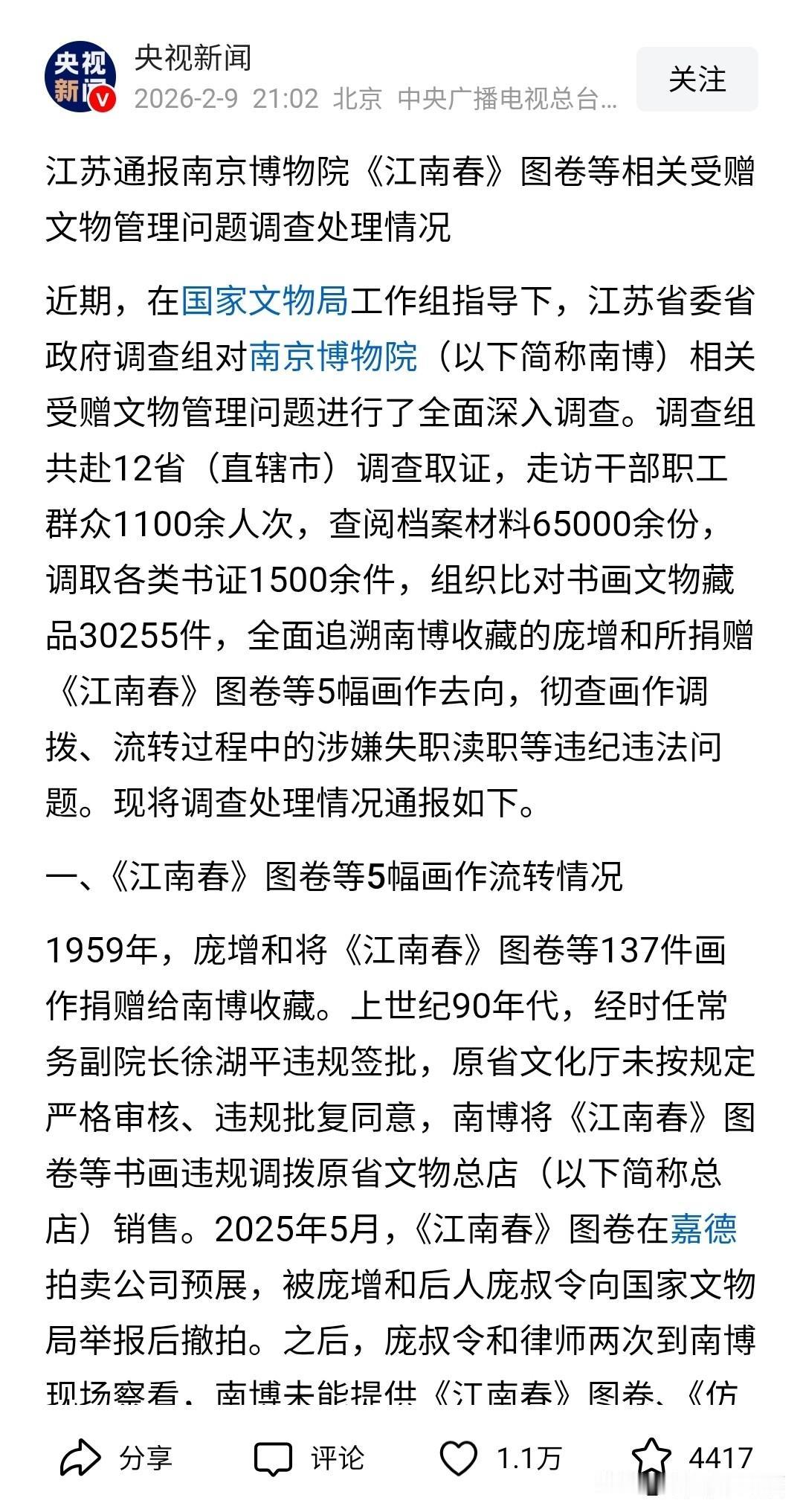 南京博物院倒卖字画的调查结果出来了,可以看出,调查很细致,在这么短的时间内做了如此大量的工作实属不易,整个脉络也很清晰,为调查组点赞👍🏻 但问题来了,不知道这件事就此结束,还是进一步深挖,尤其是像这样捐赠的物件。博物馆里的国宝应该是文化教育和科学研究的重要见证,而不是满足个人私利的买卖品。