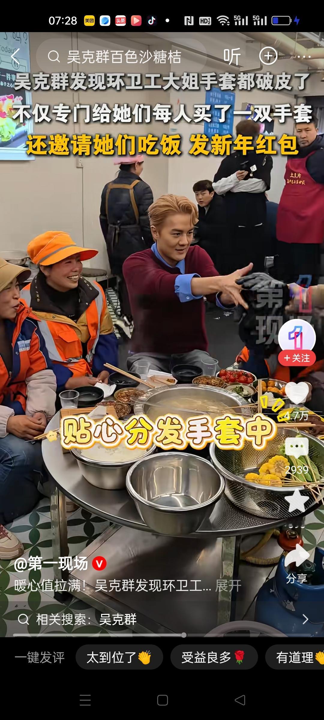 很多人说吴克群请环卫工人吃饭,又给她们发手套是在作秀,我觉得就算是作秀也是好事,也希望他能继续作秀,多做这样的秀。 视频里看细节,吴克群是很绅士的人。请吃饭有个请的手势,发手套微微点下头,很有修养,很尊重大家,没有明星的架子。 唯一不高兴的可能就是环卫局领导,小吴啊,低调点,你这样让他们很没面子。
