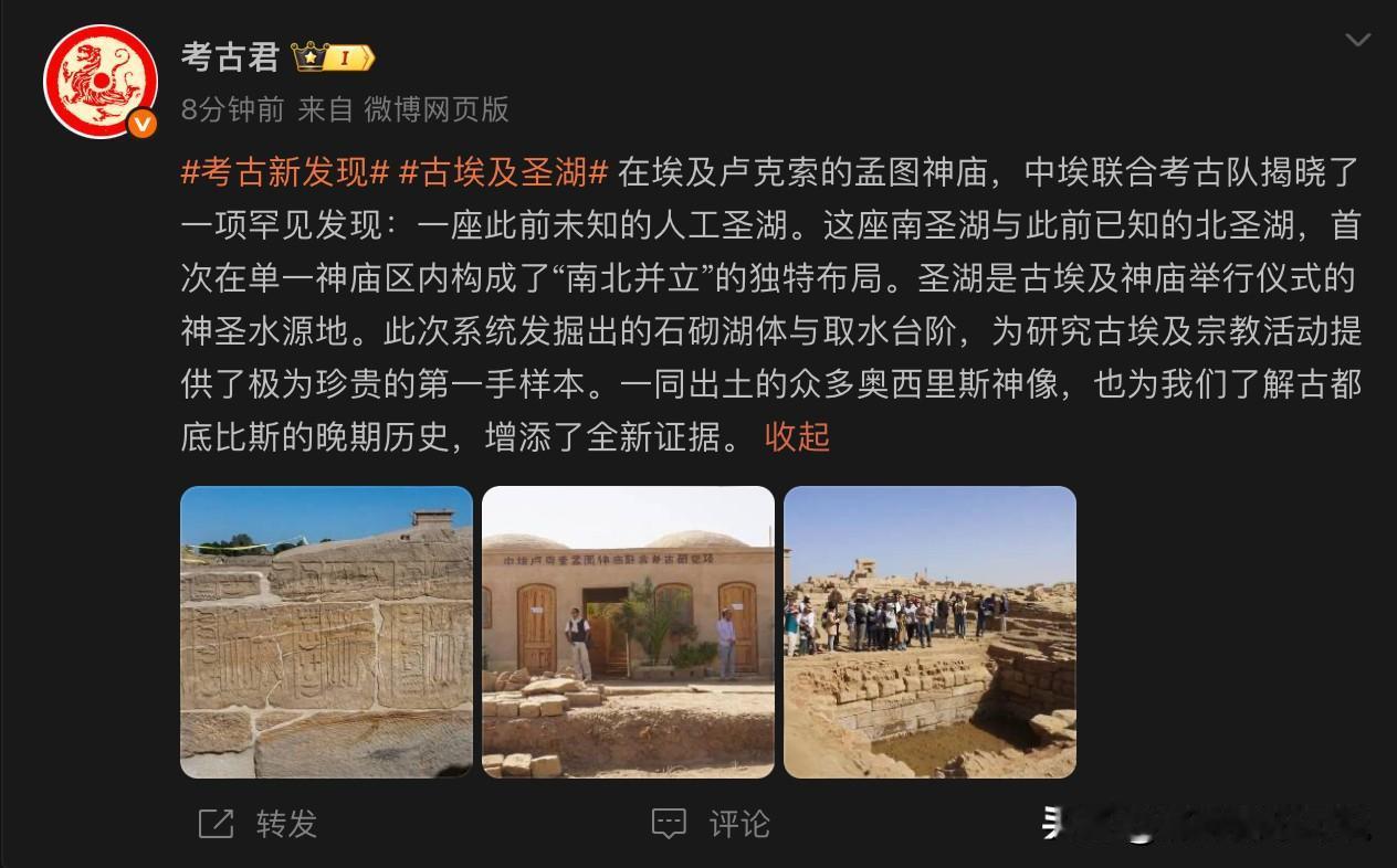 中埃联合考古又有重大发现,在卢克索孟图神庙又发现一座蓄水池,被称作圣湖,与之前发现的北圣湖并称为南北双圣湖,主要用于神庙举行仪式的水源地!从现场拍摄的照片来看这座所谓的圣湖面积和蓄水量并不大,可能就方圆十数米,深两三米。防渗漏方面也许是年深日久吧,现在看来干燥的沙漠中这样蓄水,估计一天就会全部漏光光。此外,石头上的石刻怎么看都像是贴上去的,而不是在石头上刻的,不知道是古埃及人喜欢这样的制作工艺,还是其他啥原因,期待懂行的老铁们科普一下!