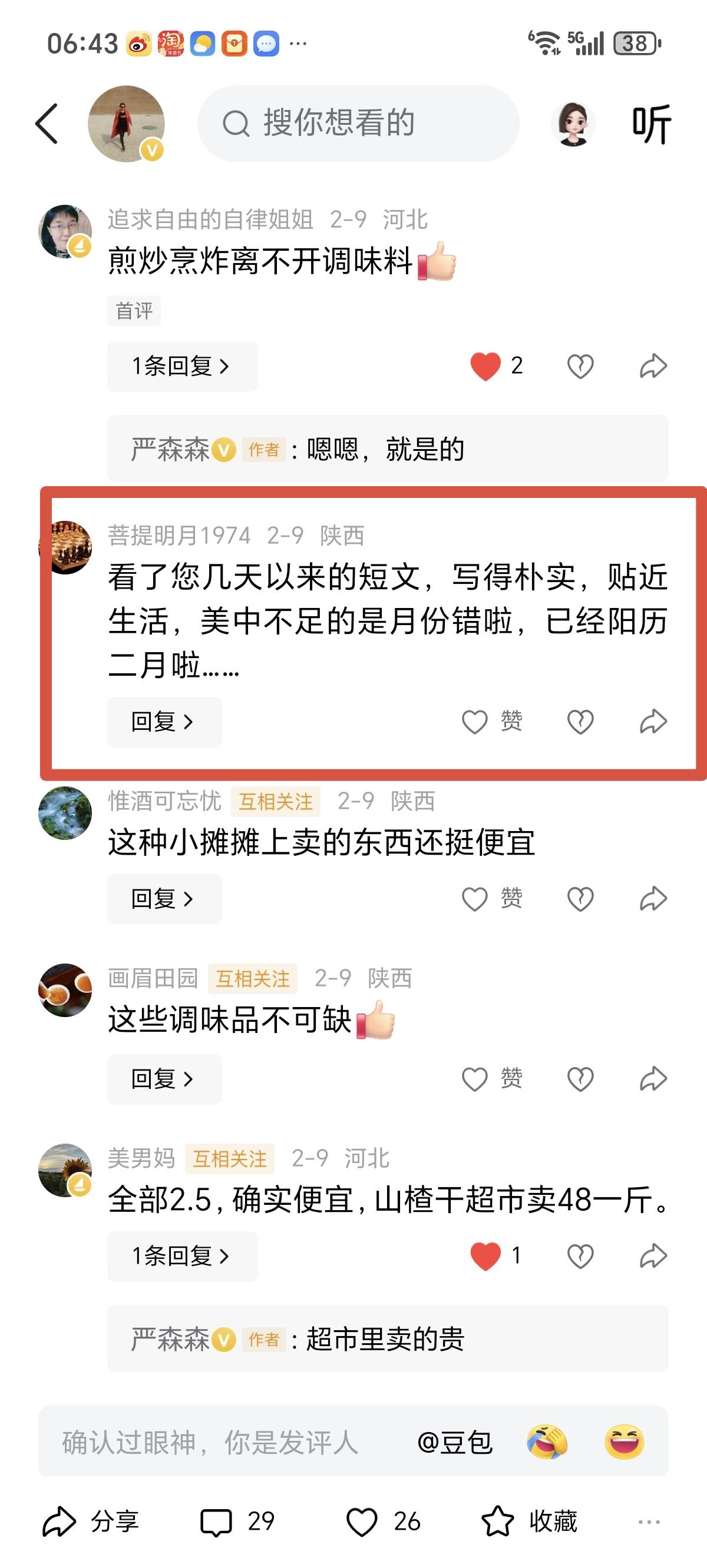 2月10日的第一份感动来自一位网友 他叫@菩提明月1974 ,最近快过年了,我还没放假,这几天写各种总结报告,写头条有些敷衍了,一连三天写的头条日期都错了,2月写成了1月,虽然还是有很多好友留评,但这是唯一的一个指出错误的网友。 他是认真的人,说明这位网友是用心在阅读,不是敷衍几句,我喜欢这种真诚,我一直以为真诚是真实,藏着对别人的尊重,藏着自己的分量,是一份难得的质朴。 感恩,感谢![比心]