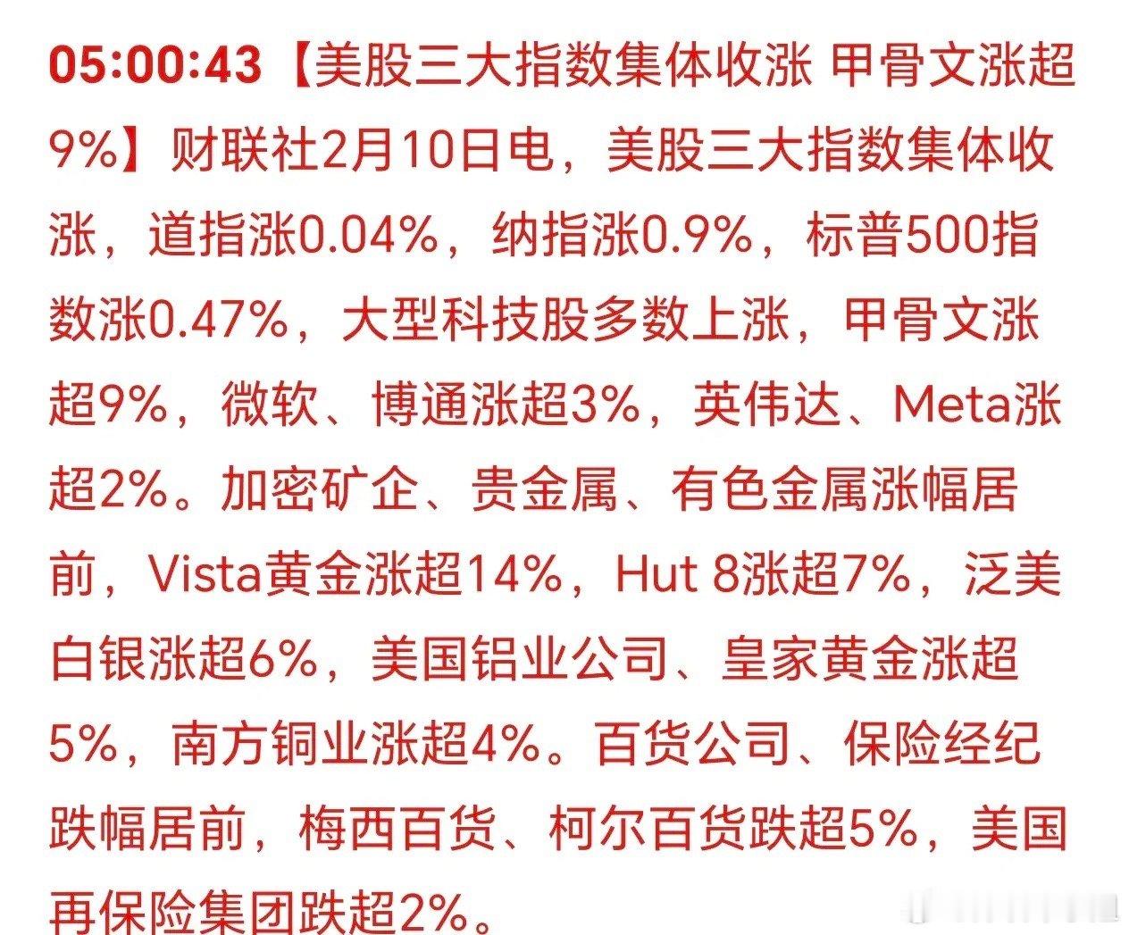 美国三大股指集体上涨!