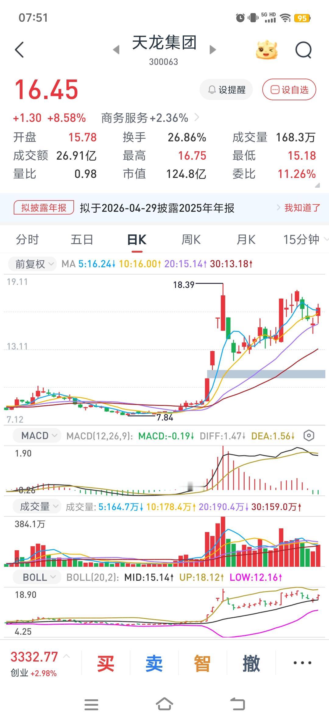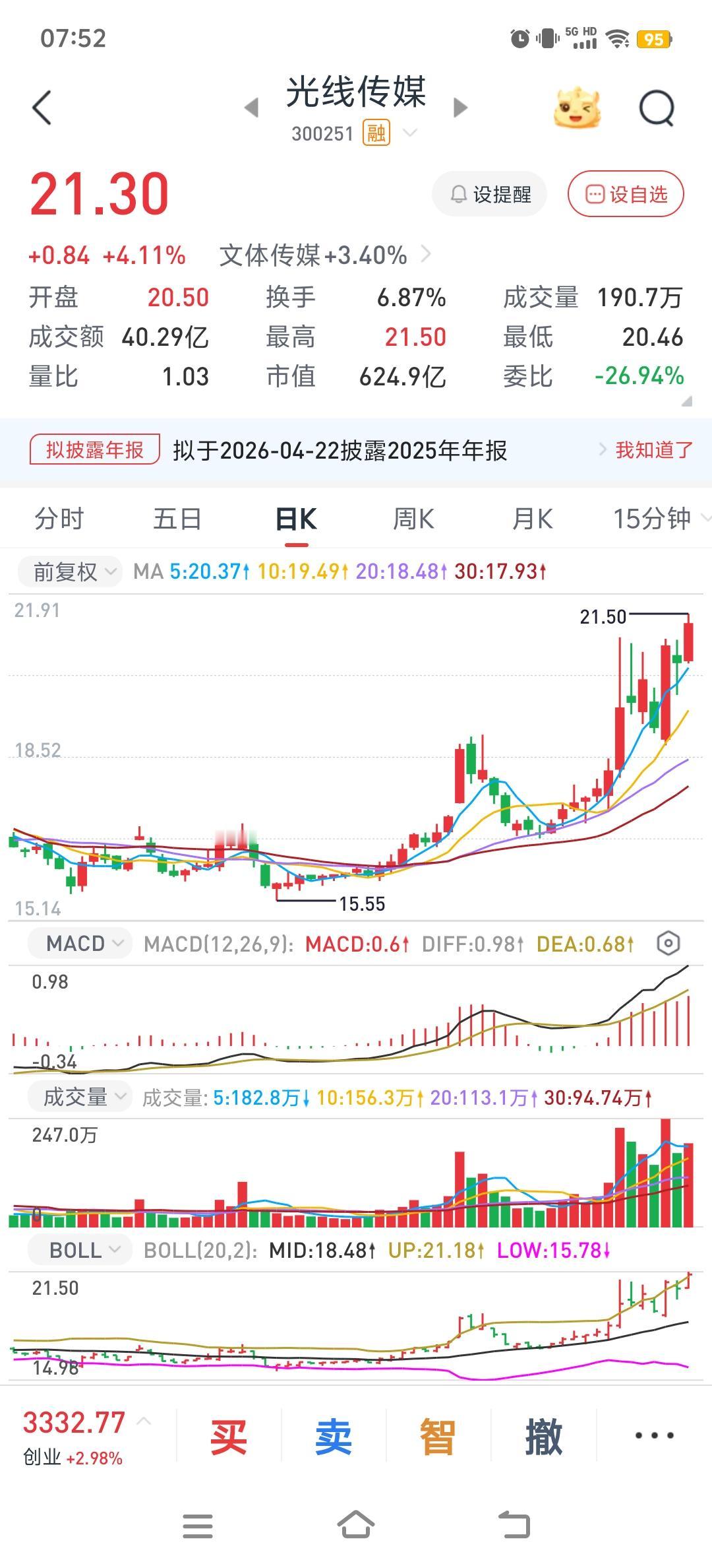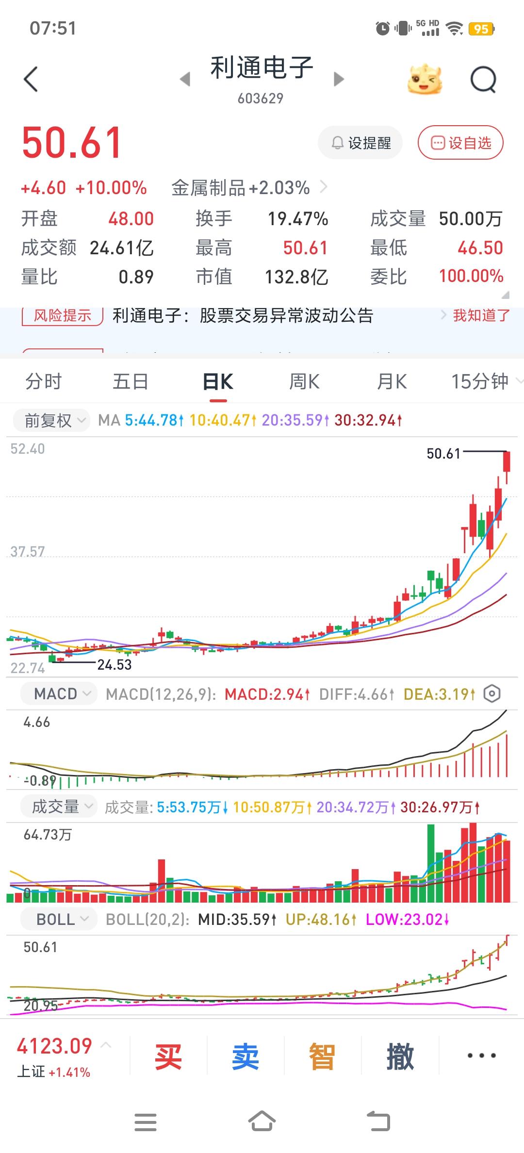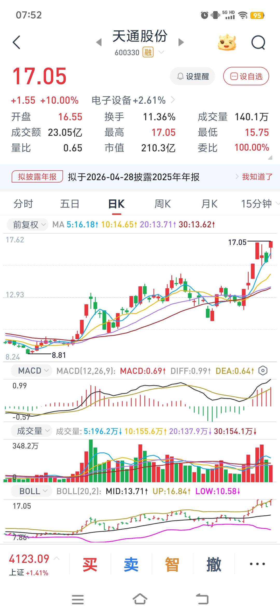 最近一段时间,一直都有朋友和我说,顺势而为。 昨天股市大幅反弹,很多股票都大幅上涨,创新高。今天的大盘,大概率还是稳住大盘炒作个股的行情。我感觉我是不是过于谨慎,看错了行情。 不过,大涨的股票还是集中在强势股票,那些股票前面一直大涨,主力资金没有出的来,像CPO板块股票,已经连续炒作了两年多了,很多股票都翻了十倍以上,依然强势,领涨大盘。我两年前进入CPO板块,是在他们的起涨点,那个时候才刚刚启动,成长性,业绩都好,估值合理,但是我的想象能力不够,错失了几波大的机会,像CPO板块股票应该一直盯着做。 这次调整行情,比我想象的要短,才几天,又上涨到了4100以上,六十天线现在看来支撑有效,短期下跌空间不大了,但是是不是就是止跌回稳了,还要看看,这几天4100点能不能站稳。 短线操作,还是要坚持做强势股票,最近一段时间有涨停板的股票,回调时候买入,拉高获利了结。 最近行情可以看做4010到4190的窄幅震荡行情。 不过如果看不清楚的话,持币等待也是一个好的策略,等一个好的,确定性的机会。我最近几天和朋友聊天时候,说是看好春节电影行情,那几个电影股票,短线操作,其他股票行情还是看不清,等一个主线板块,出现再说吧。
