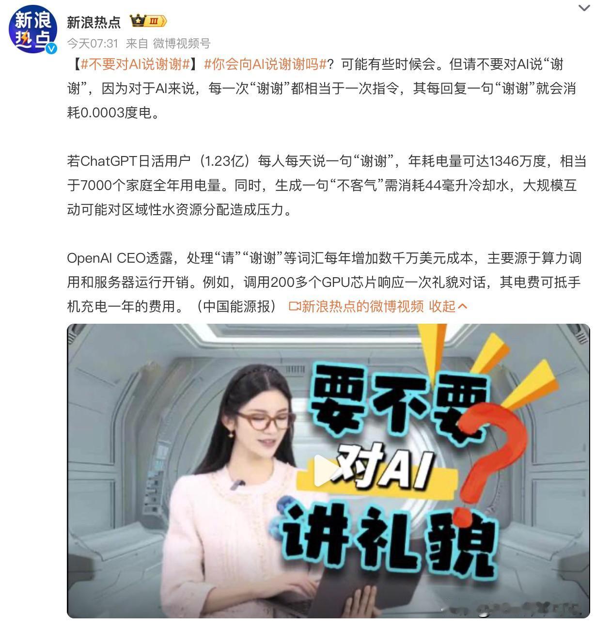 强烈建议不要对Ai说谢谢,原本以为这只是一个梗而已,但看了这篇文章后才知道“不要对Ai”说谢谢是有自己底层逻辑的!其逻辑就是一旦发出谢谢指令就会消耗0.0003度电,以ChatGPT日活1.3亿用户计算,每人说一句谢谢就会消耗1346万度电,相当于7000个家庭的全年用电量,还会增加AI服务器的冷却用水量。而且Ai在处理谢谢、请等词汇时还会增加数千万美元成本!由此看来,好像是有点儿道理。但意义并不大,就好像建议每人每天少吃一口饭就能救助大量饥饿人群一样。只能说该怎么做就怎么做,没必要为一句谢谢改变自己的生活习惯,愿意说就说、不愿意说就不说,本来活着就已经够累的了,何必为难自己呢?